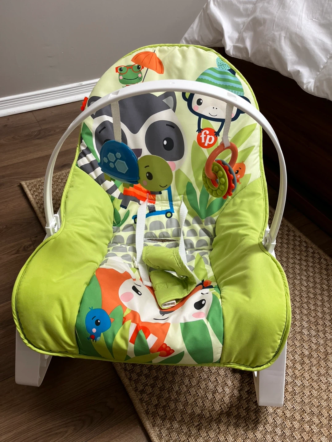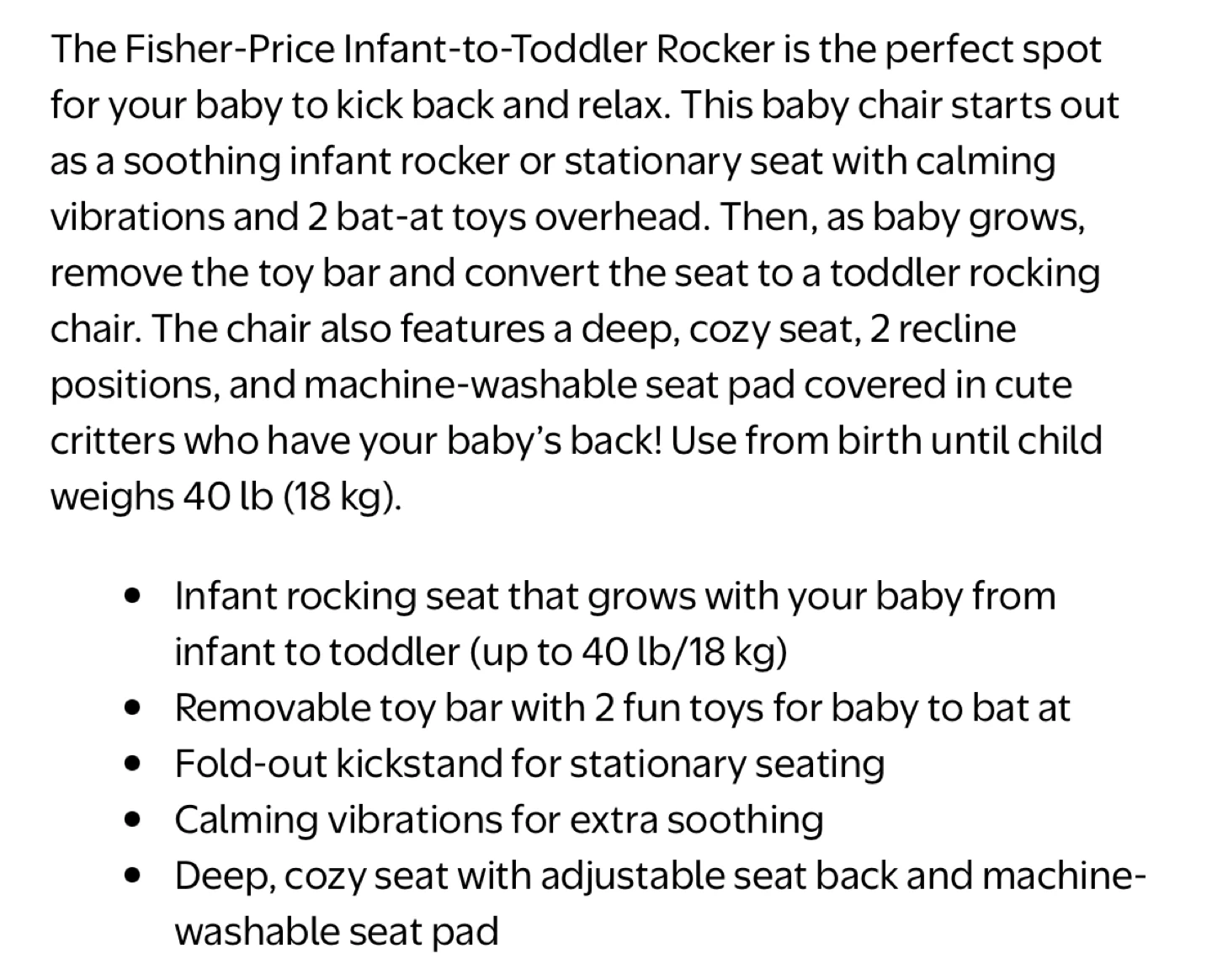 cozy seat, 2 recline positions, and machine-washable seat pad Recommended for use from birth until child weighs 40 lb (18 kg) - Infant rocking seat that grows with your baby from infant to toddler (up to 40 lb/18 kg) - Removable toy bar with 2 fun toys for baby to bat at - Fold-out kickstand for stationary seating - Calming vibrations for extra soothing In perfect condition Pick up only Cash only
