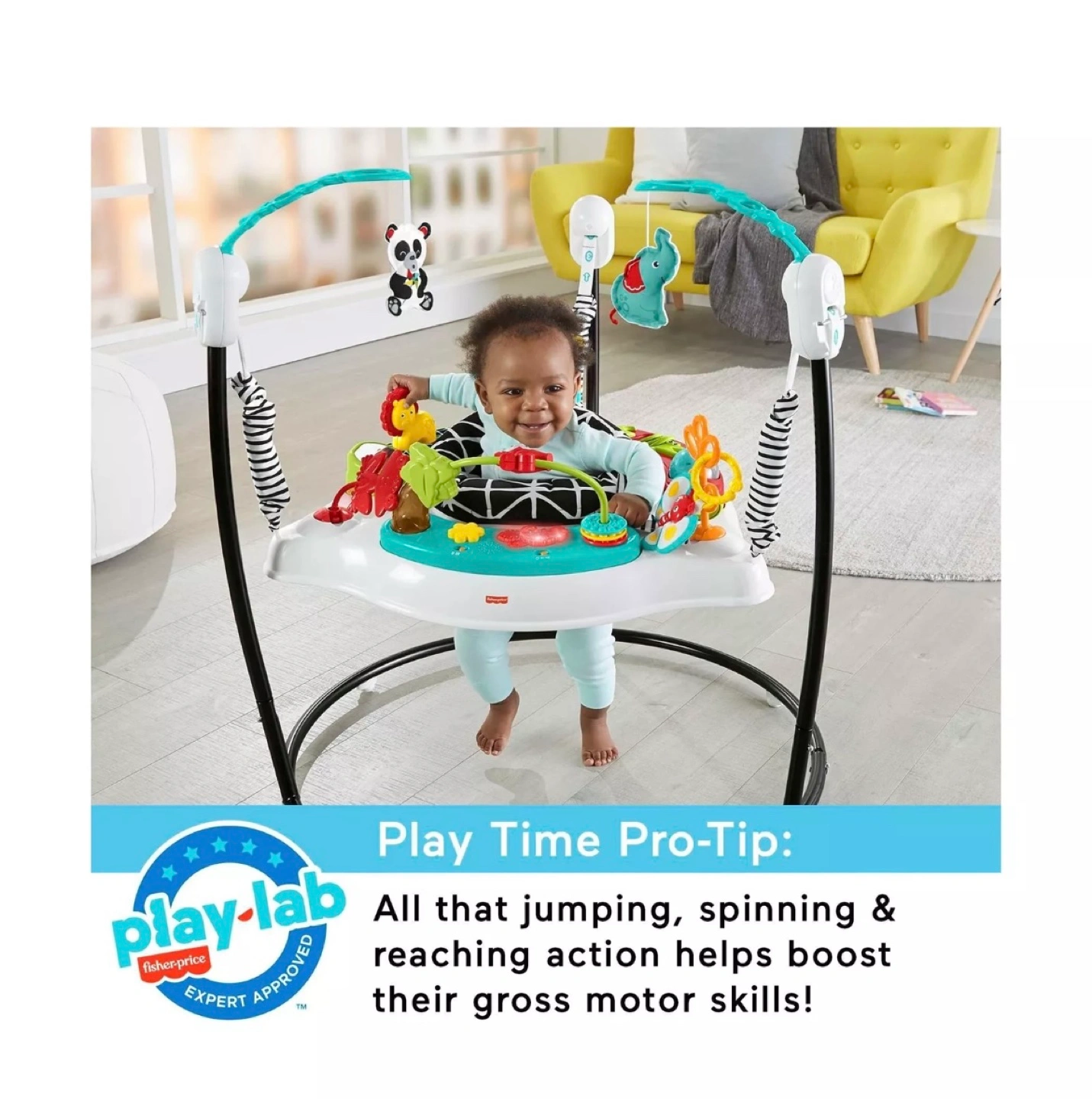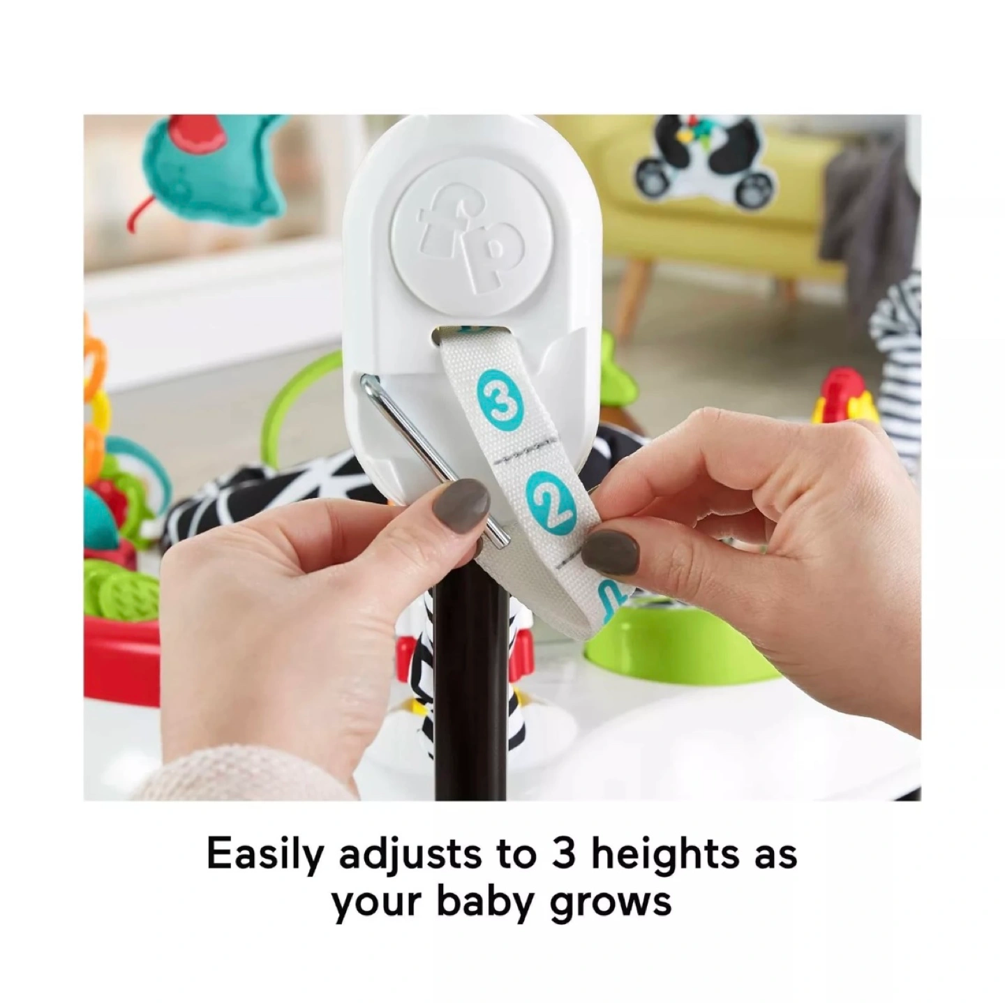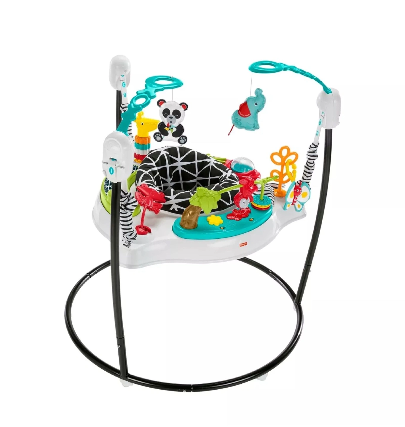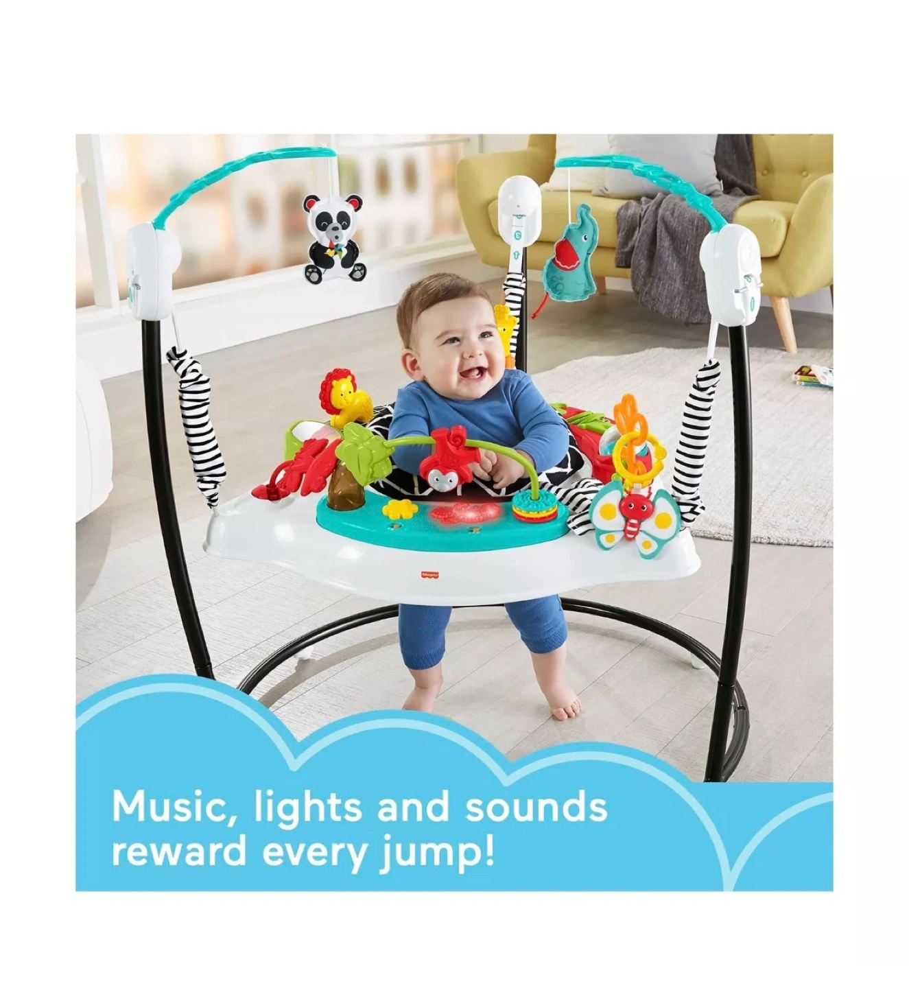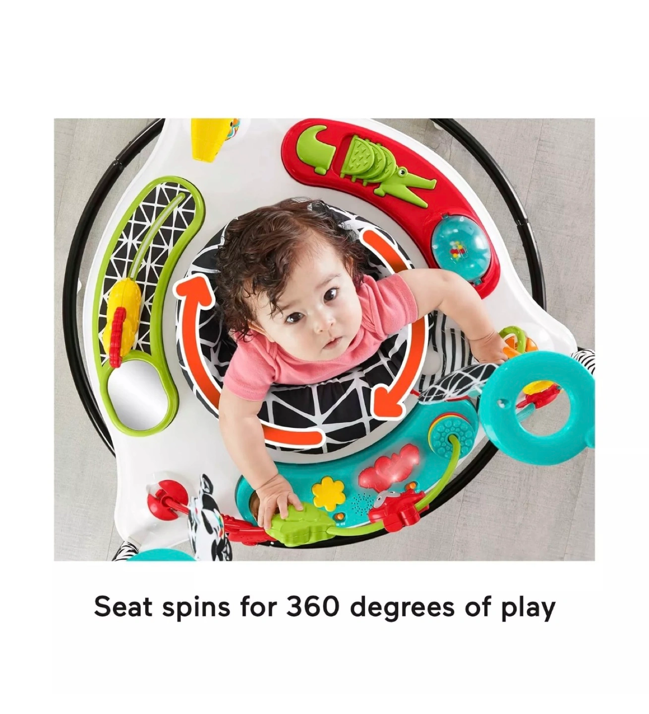 Baby Jumperoo with lights and sounds. Adjustable to 3 heights. Seat spins 360 degrees.