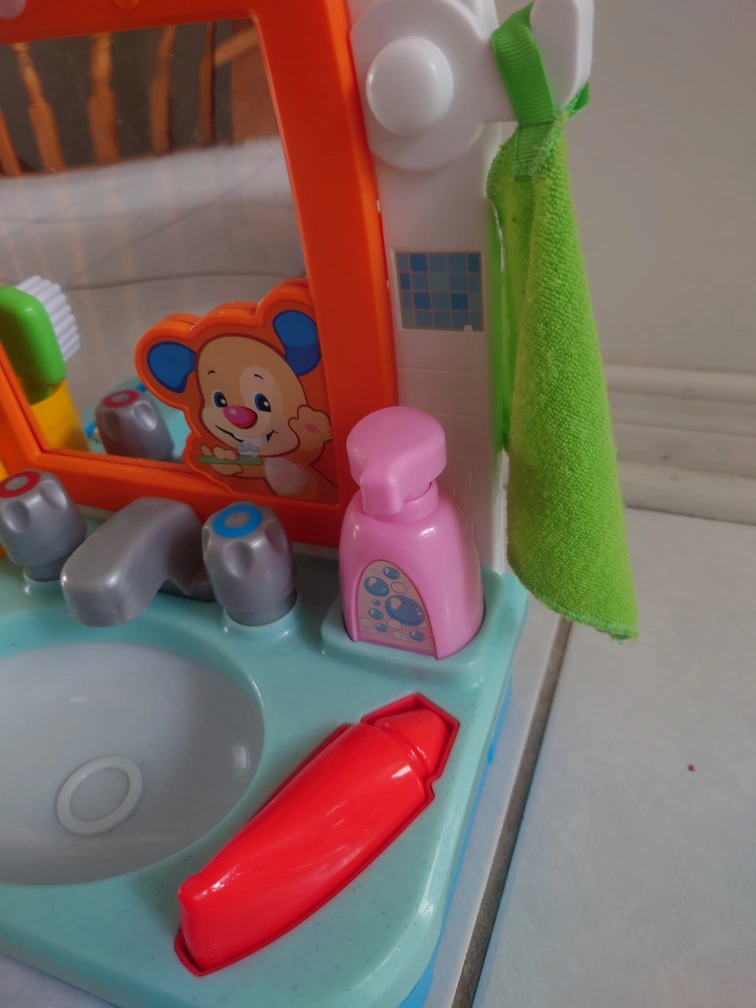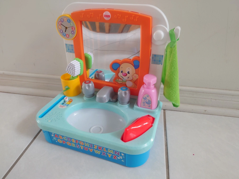 Interactive playset. Features sink, mirror, toothbrush, toothpaste, soap bottle, and towel. Includes sounds and songs. Great for imaginative play.