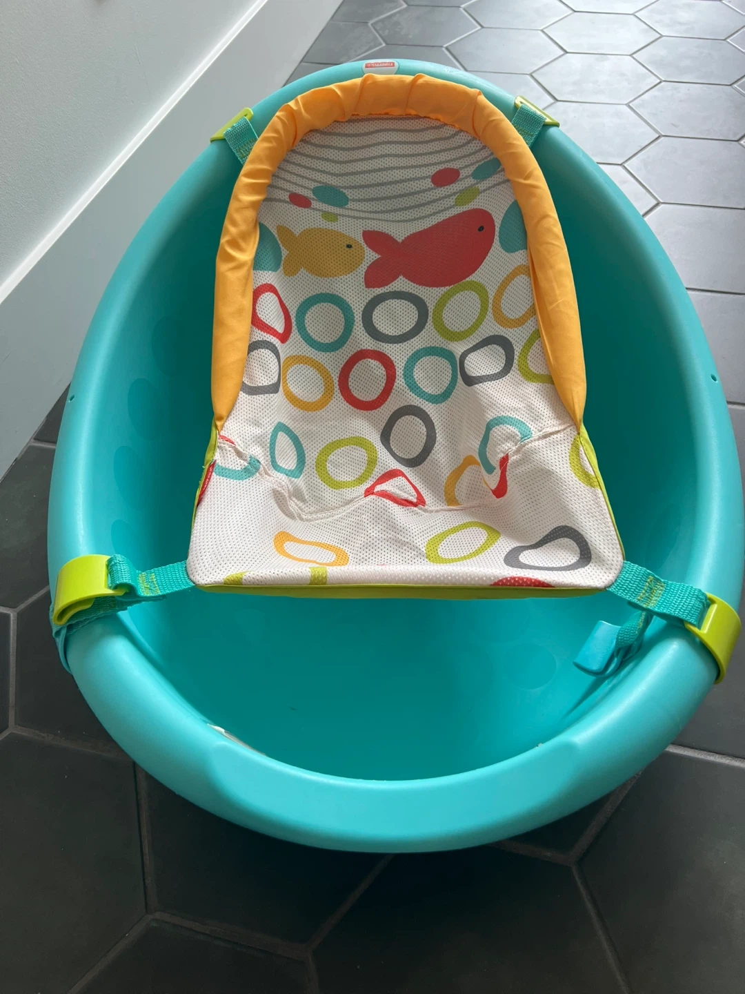 853 stage bathtub grows with baby from newborn to toddler. Stage 1 - infant sling comfortably cradles little one at a gentle recline, in just the right amount of water. Stage 2 - the sling easily adjusts to provide the right amount of support for older babies to sit more upright, while still helping to prevent slipping and sliding in the tub. Stage 3 - remove the sling for toddler tub time. Plenty of room for a toddler to sit and play. The sling converts to a mesh pocket storage bag to dry and store tub toys. Sling is machine washable. And the tub is in great condition. Has a drain plug for quick and easy drain and dry.