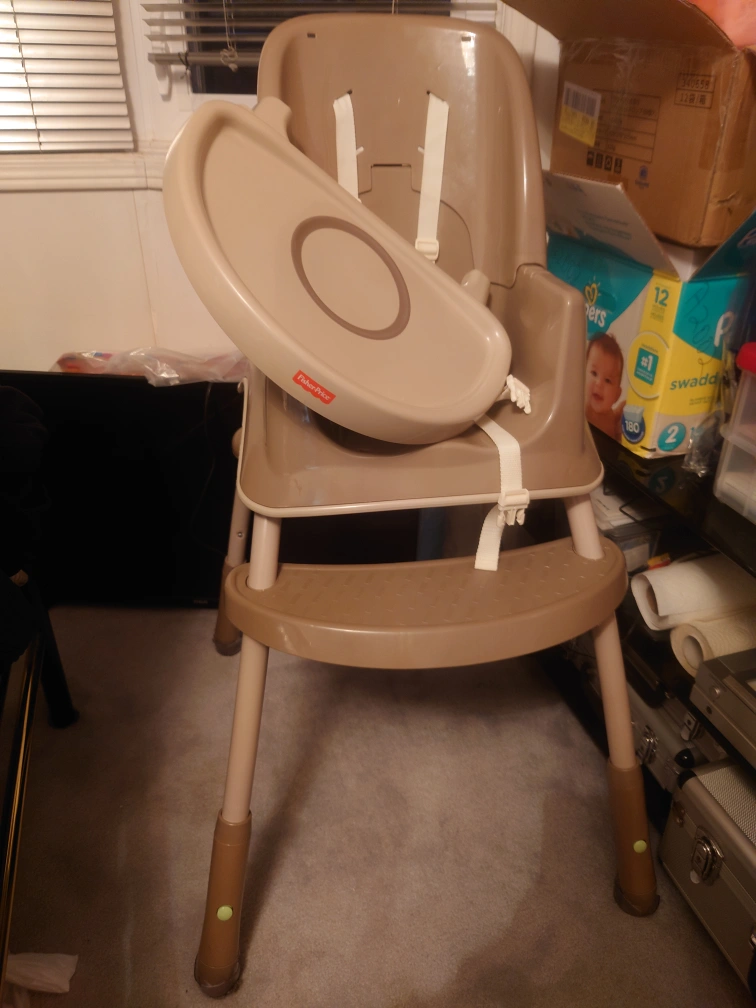 Tan high chair, includes tray and footrest. Adjustable straps. Good used condition.