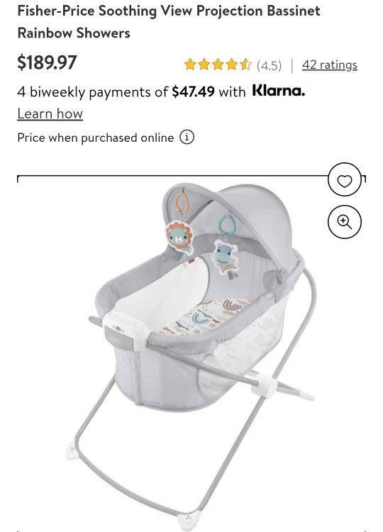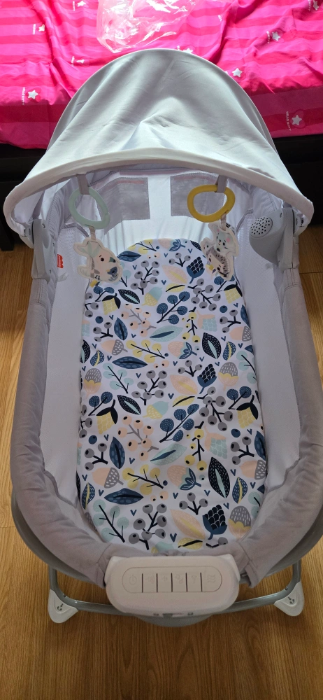 Create a soothing baby sleep environment with this Fisher-Price projection bassinet. Its gentle rocking motion and various sound profiles will lull your child to sleep. The retractable canopy has hooks for two hanging toys and acts as the projection surface for the built-in starry light projector. This portable cradle also folds up for storage.