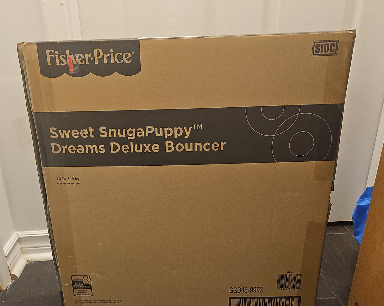 Selling a Fisher-Price Sweet SnugaPuppy Dreams Deluxe Bouncer! The box indicates it supports a maximum weight of 20 lb or 9 kg