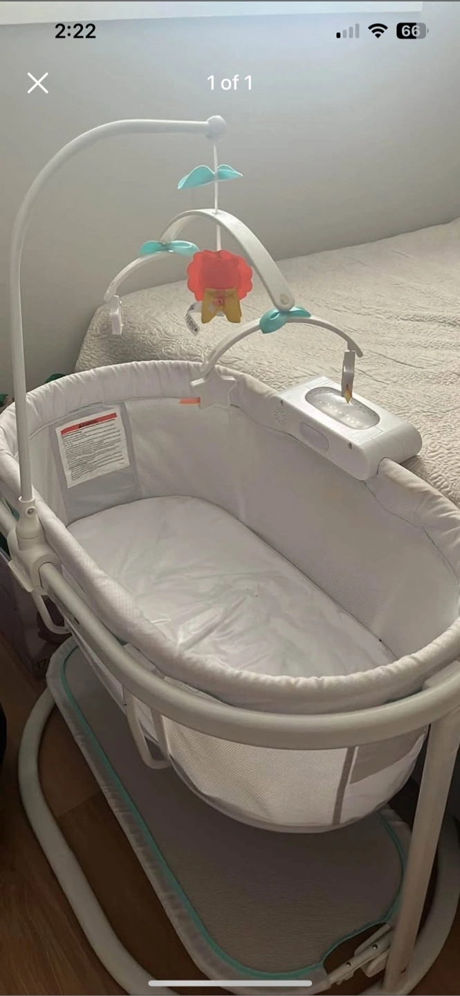 Selling a gently used baby bassinet! It comes with a cute mobile to keep your little one entertained. Perfect for newborns, this bassinet is a cozy and safe place for your baby to sleep. It's in great condition and ready for a new home!