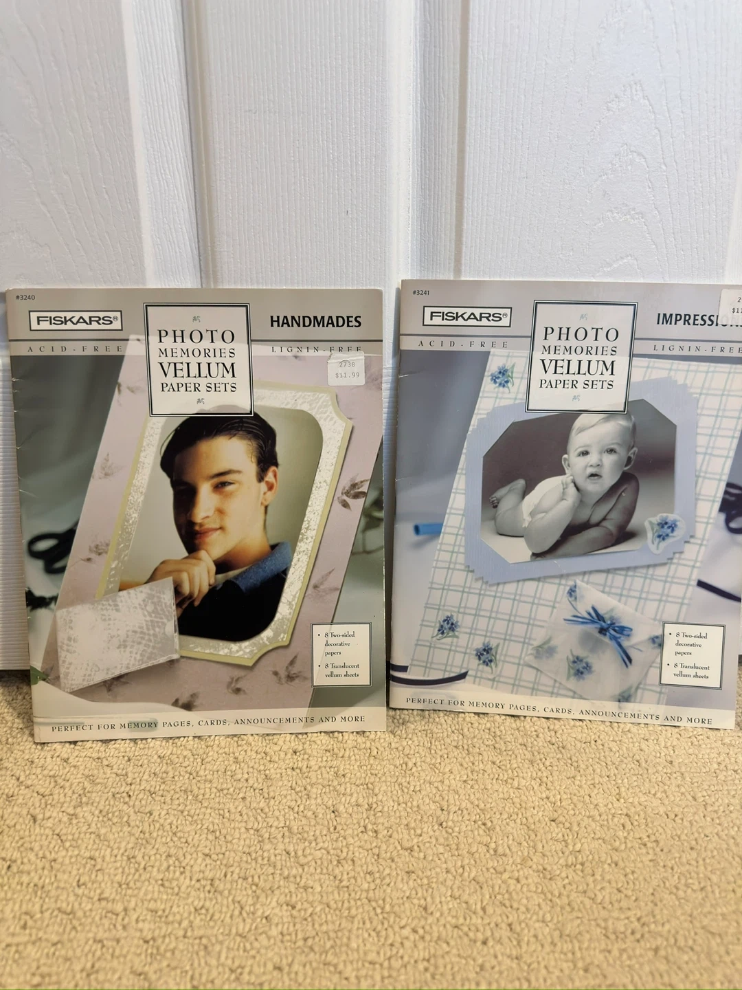 Selling two Fiskars Photo Memories Vellum Paper Sets. One is the Handmades set, and the other is the Impressi set. Each set includes two-sided decorative vellum sheets and translucent accents. Perfect for memory pages, cards, announcements, and more!