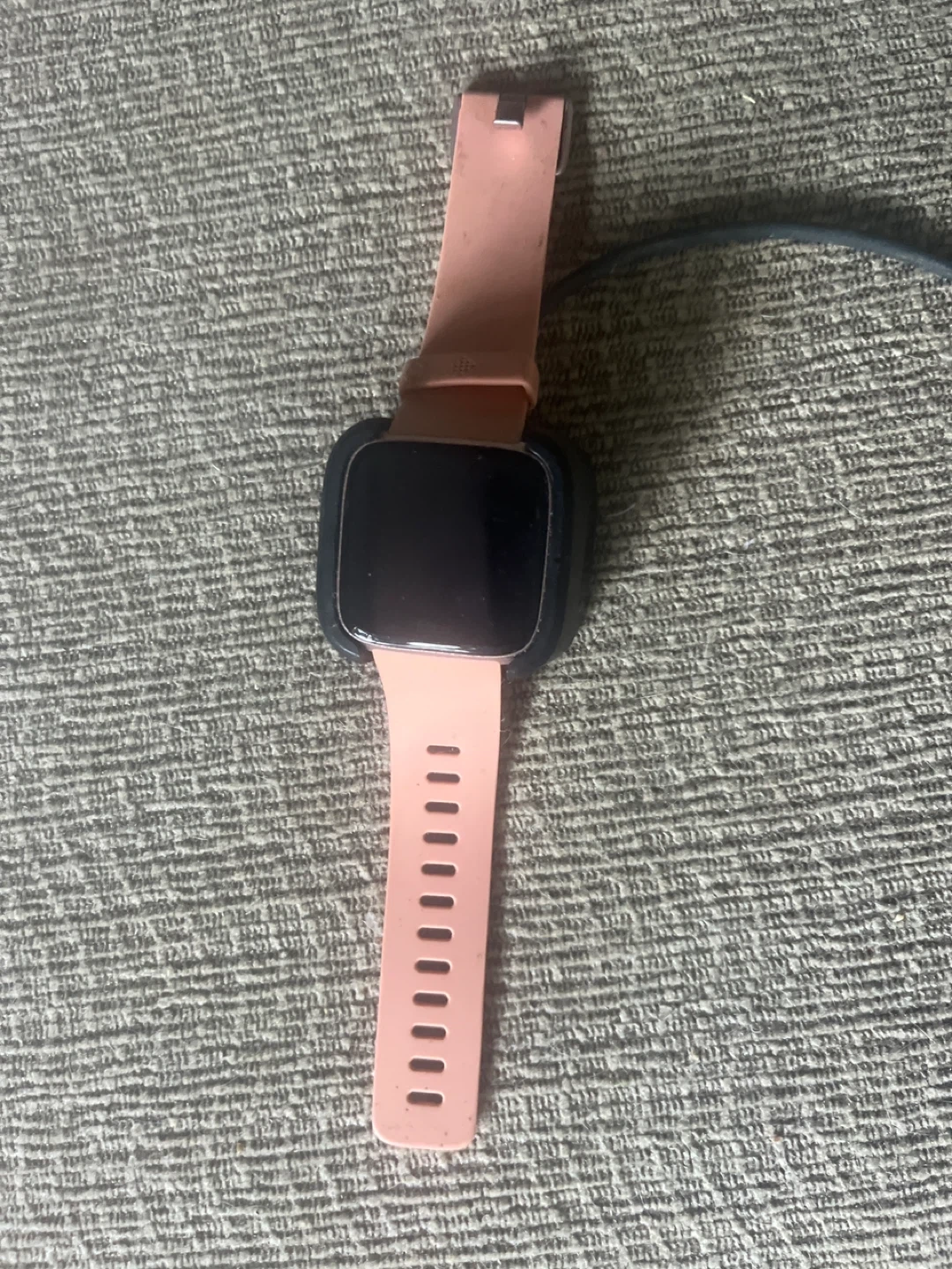 Selling a Fitbit Versa smartwatch with a peach-coloured band. It's in good condition and ready for a new owner! It comes with a charger.