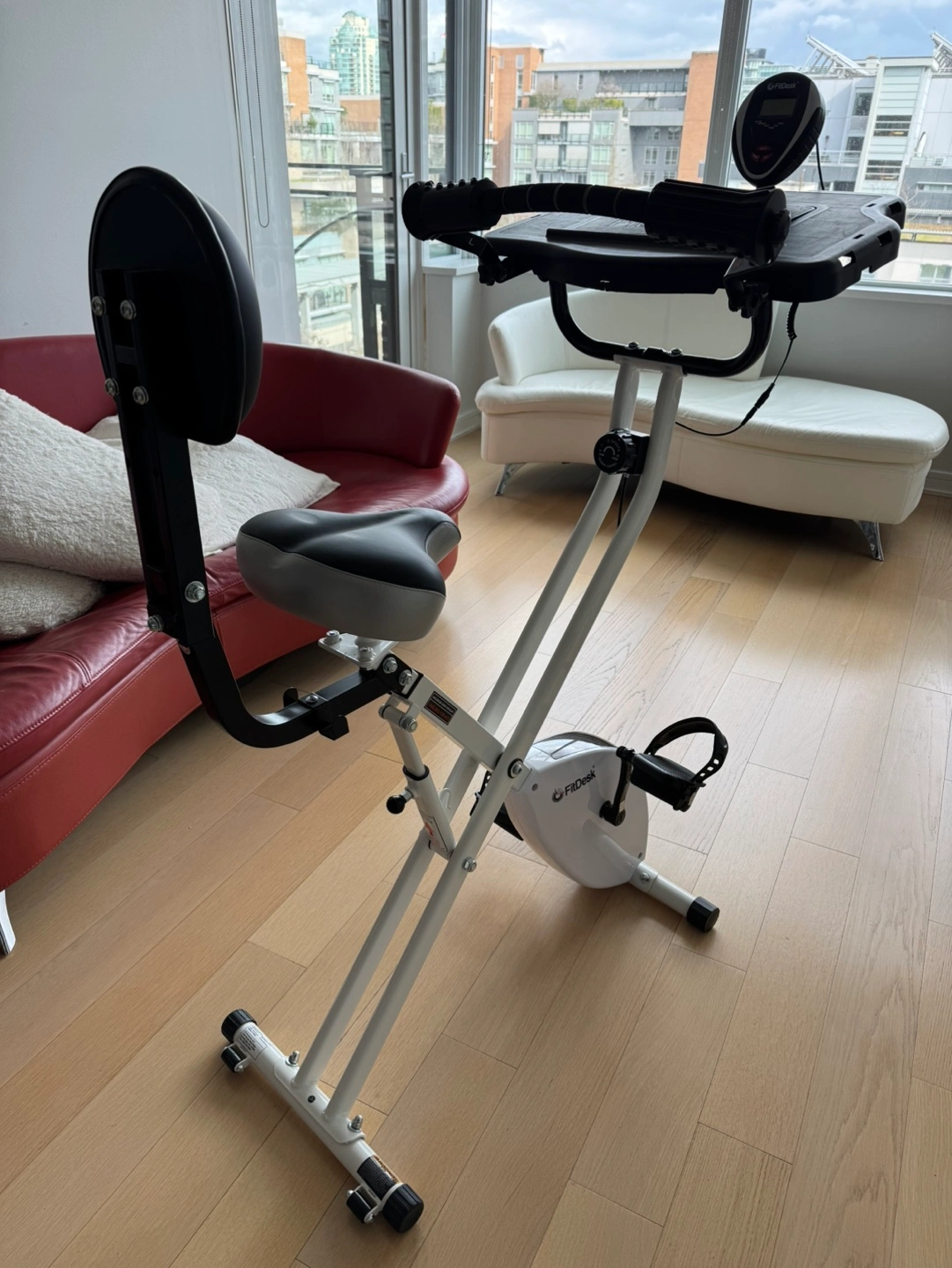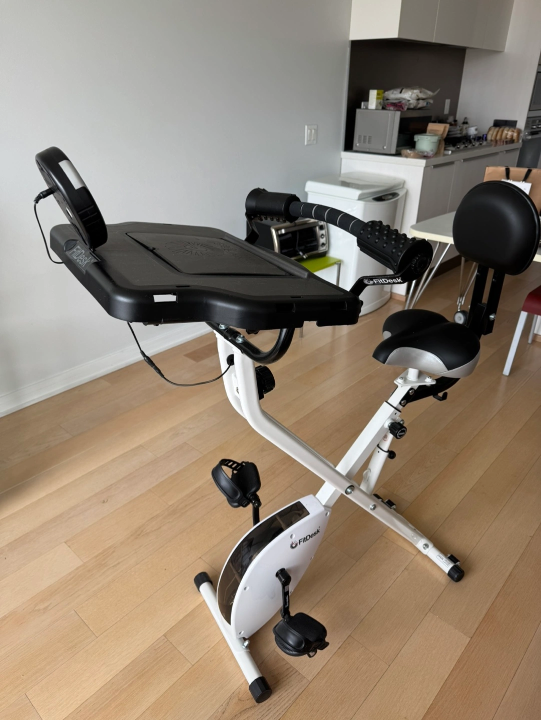 Used FitDesk FDX 3.0 under-desk exercise bike. Good condition. Features a built-in desk and adjustable seat. Compact and foldable design. Perfect for home use.