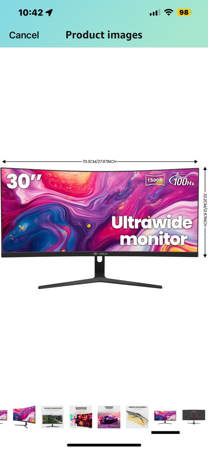 Selling a 30-inch ultrawide curved monitor! It has a 1500R curvature and a refresh rate of 100Hz. The dimensions are 70.3cm/27.67inch wide and 32cm/12.6inch high, making for an immersive visual experience