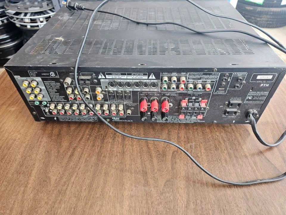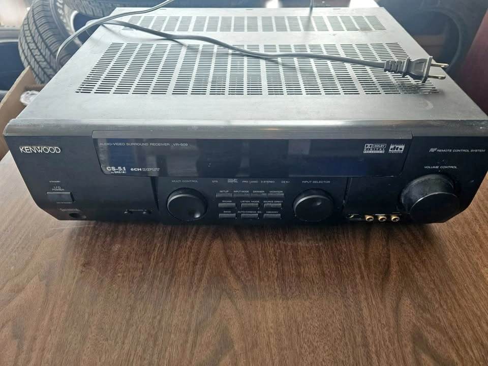 Kenwood VR-509 audio-video surround receiver. Supports Dolby Digital, DTS and Dolby Pro Logic II. 5.1 channel output with subwoofer pre-out. Multiple analog and digital inputs including optical and coaxial. Front headphone jack and AUX input. Cosmetic wear consistent with age. Untested. No remote included. Sold as-is. Pickup only. Price: $120 OBO.