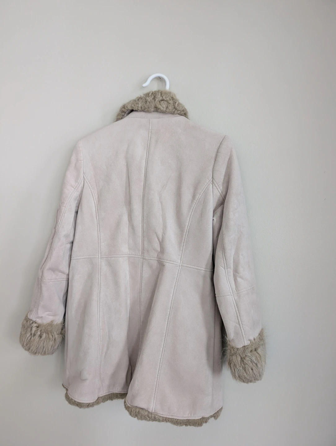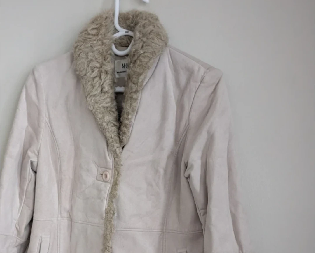 A BEGUM coat featuring a faux suede exterior with faux fur trim on the collar, cuffs, and hem. It has a single button closure and two front pockets. This coat is designed for warmth and style.