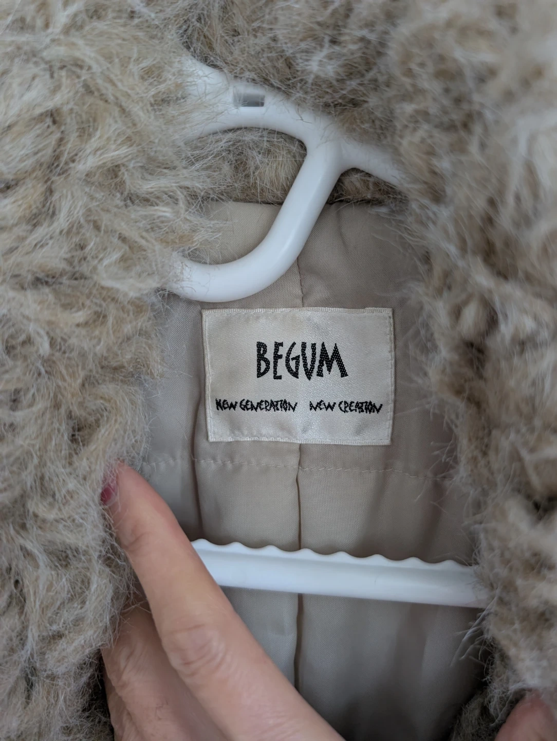 A BEGUM coat featuring a faux suede exterior with faux fur trim on the collar, cuffs, and hem. It has a single button closure and two front pockets. This coat is designed for warmth and style.