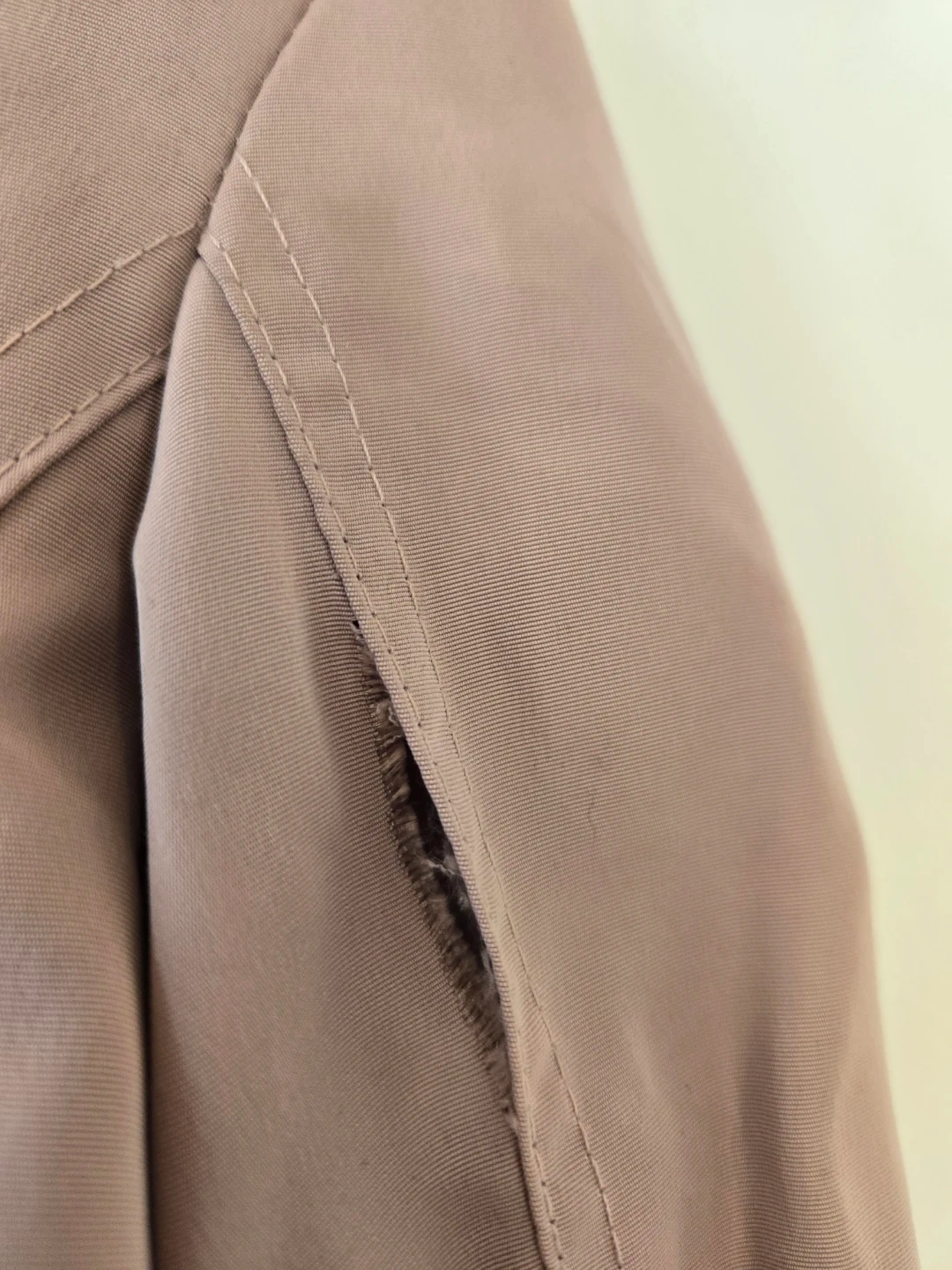 This warm parka jacket is from Love Me More. It features a cozy faux fur-lined hood (detachable) and multiple zippered pockets. The shell is a taupe-coloured polyester blend. It has some minor wear/manufacturing defect, including a small tear near the pocket on the left side. Pickup only. No refund