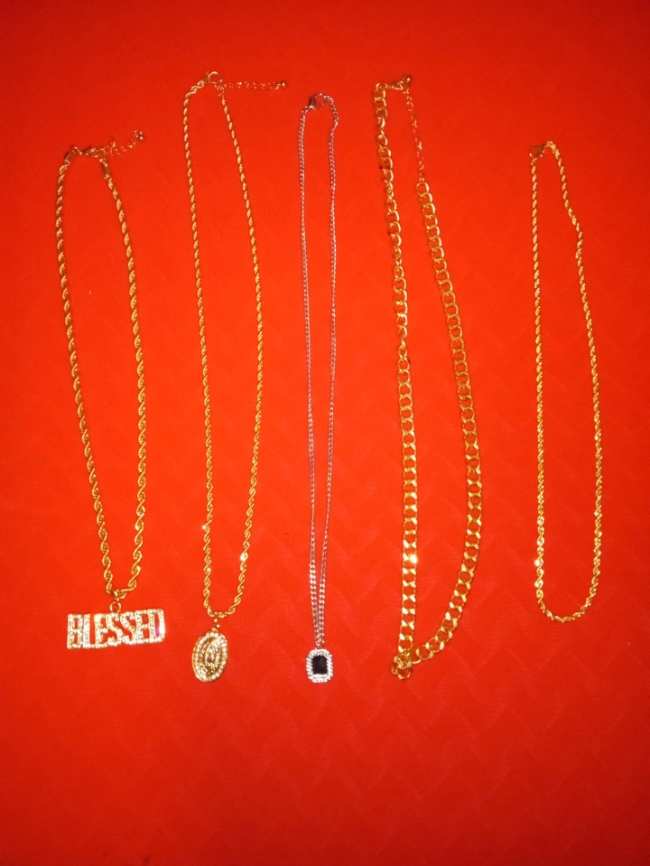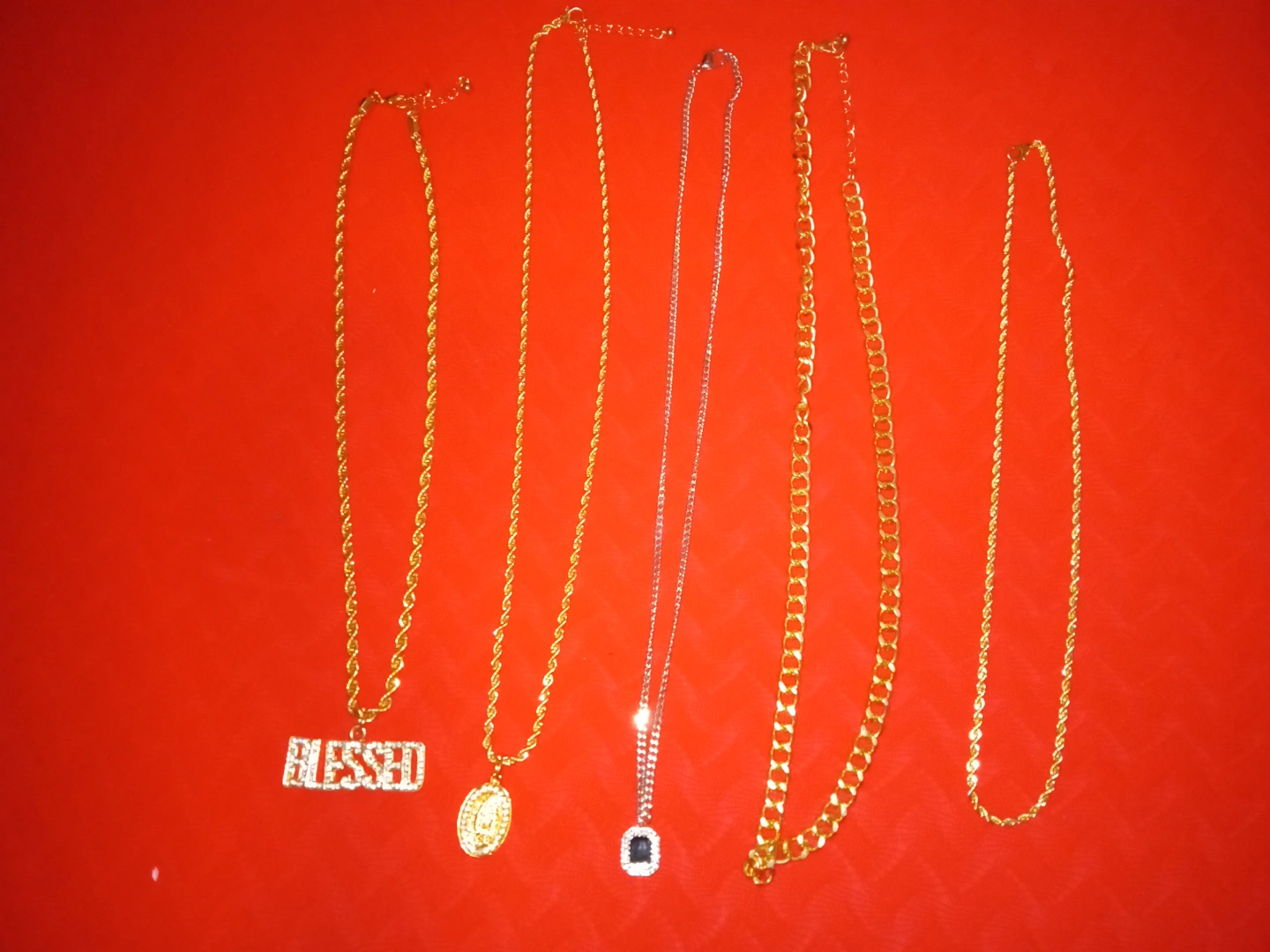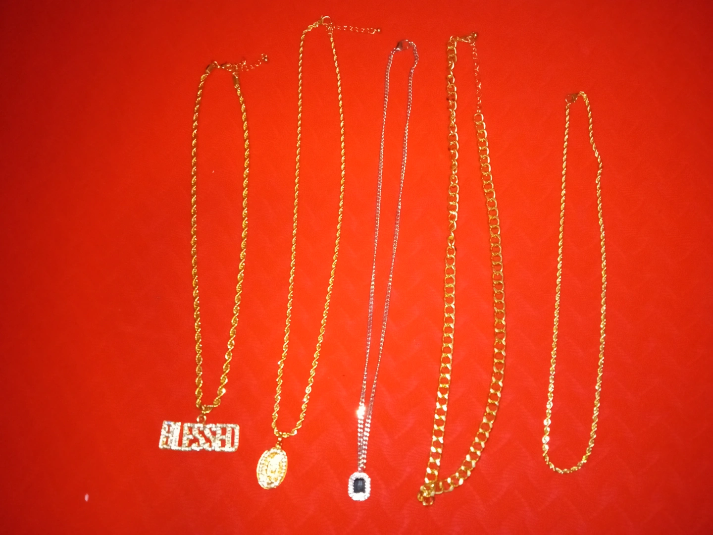 10Five necklaces. Gold chains, pendants, and one silver chain. Various lengths and styles. One pendant says 'Blessed'.