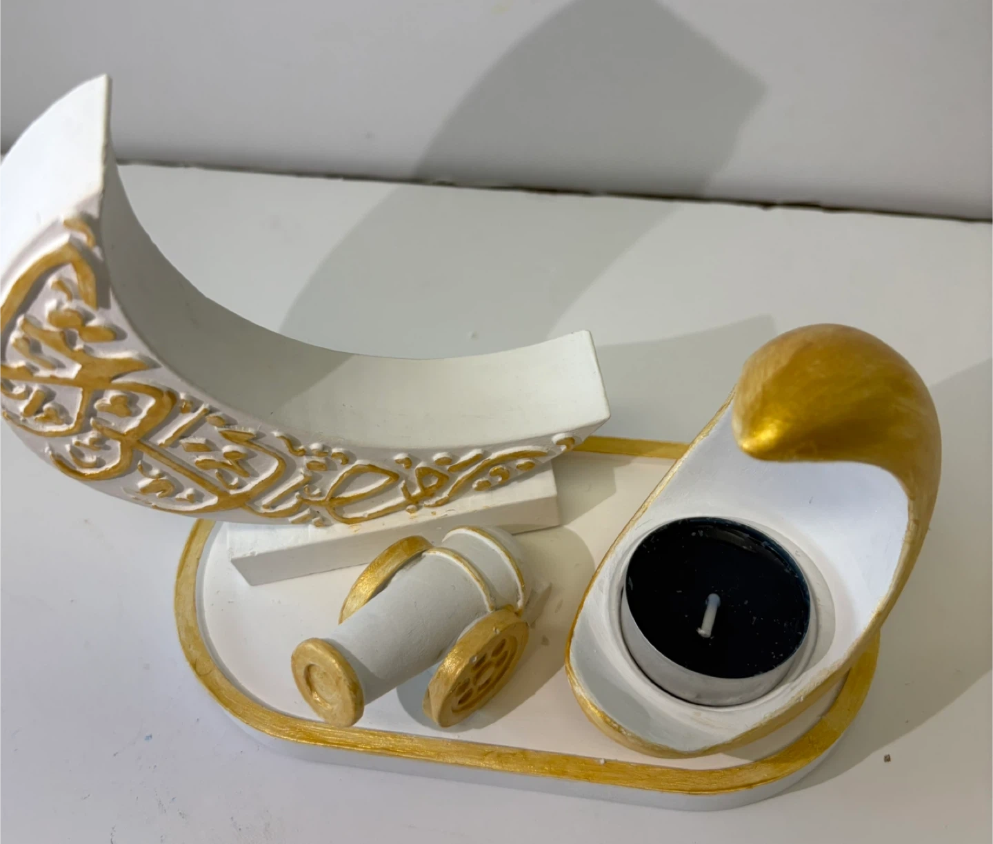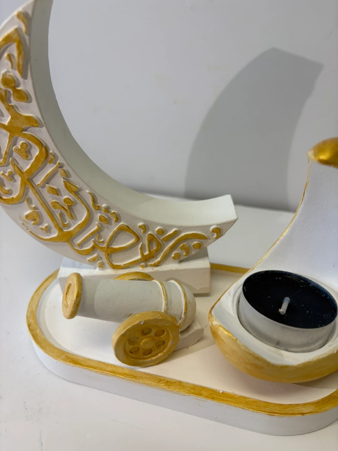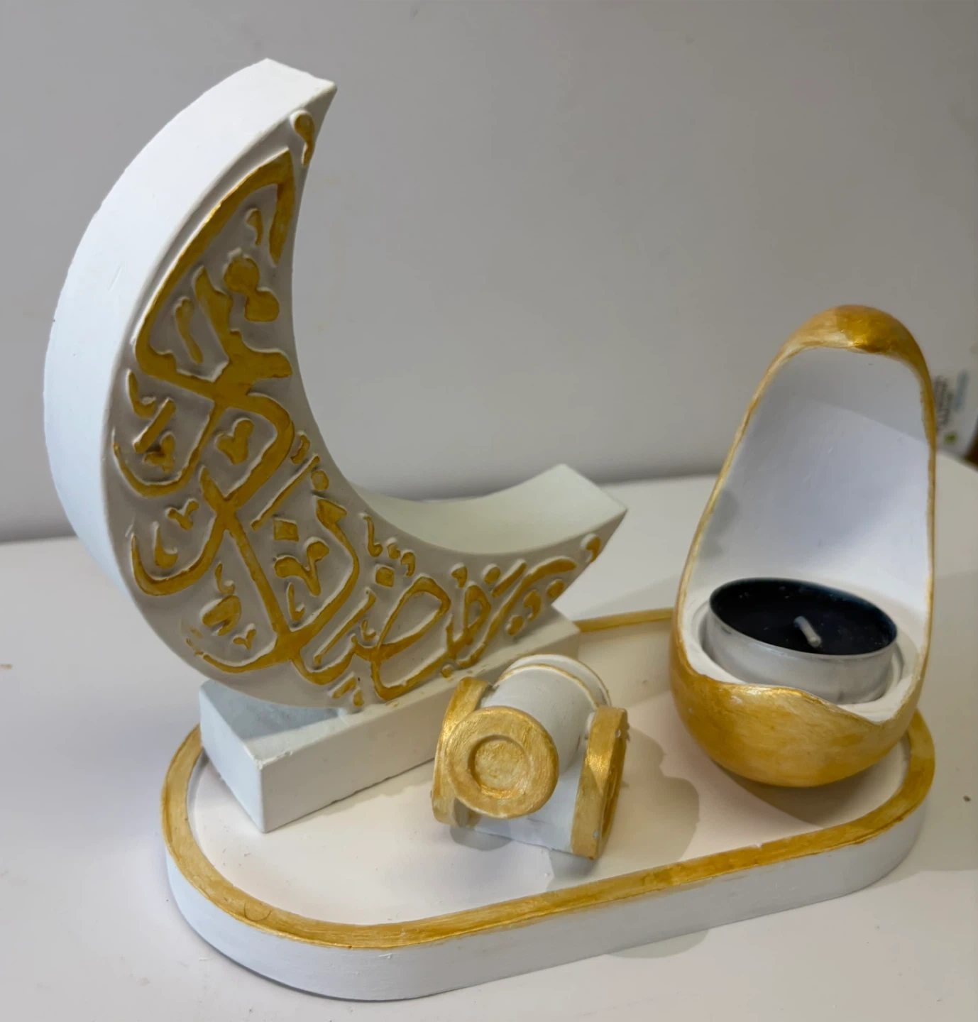 Celebrate the Holy Month with Artistry and Tradition Elevate your home’s ambiance with this handcrafted Jesmonite decorative set, designed to celebrate the spirit of Ramadan and Eid. This unique piece features a beautifully calligraphed crescent moon (Hilal) paired with a traditional Ramadan cannon and an incense burner box or you can use as trinket box set upon a sleek oval base. While this serves as a stunning centerpiece or mantel piece, it is also designed for functionality. The gold-toned box can be used as: • An incense burner (Bakhoor). • A tealight candle holder. • A small trinket dish for jewelry or tasbih beads.