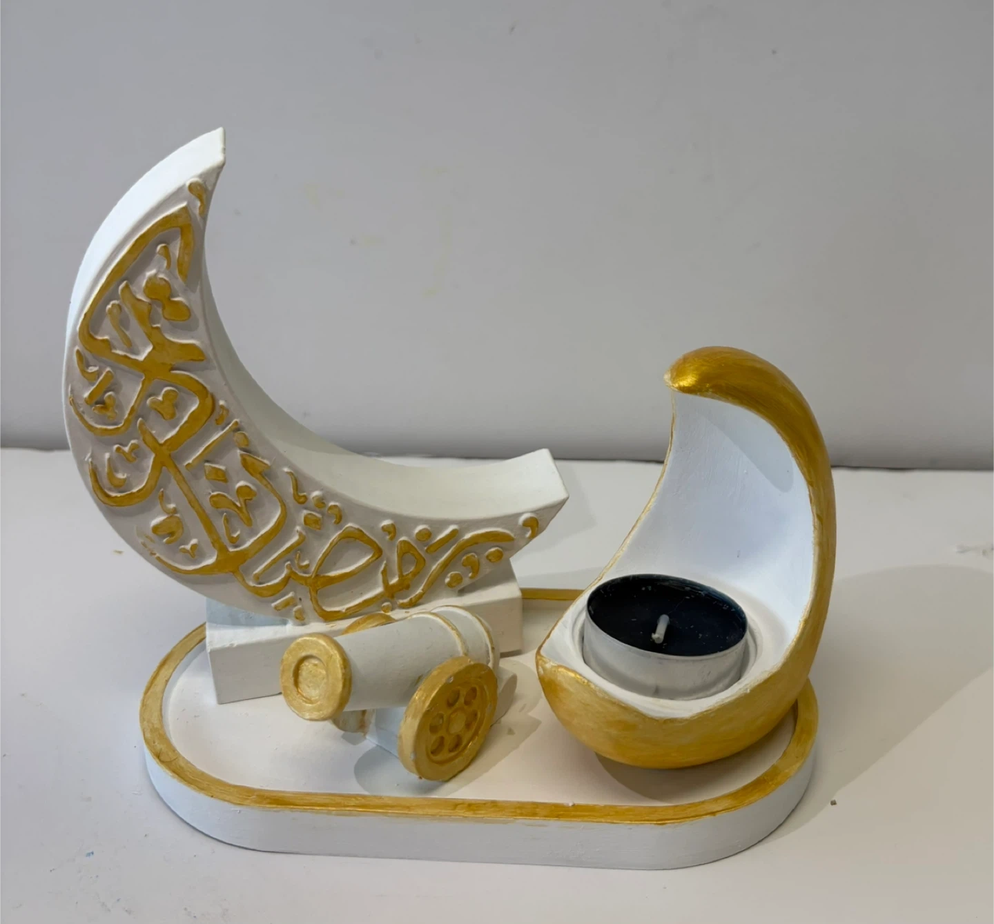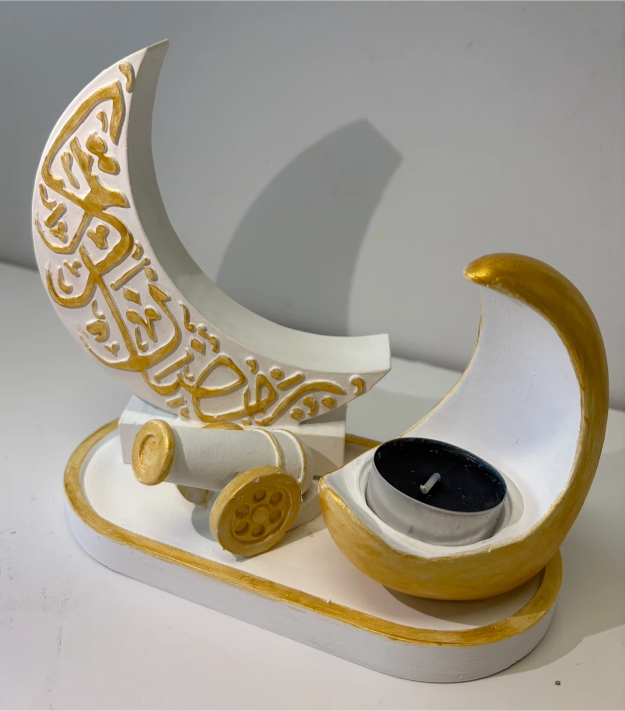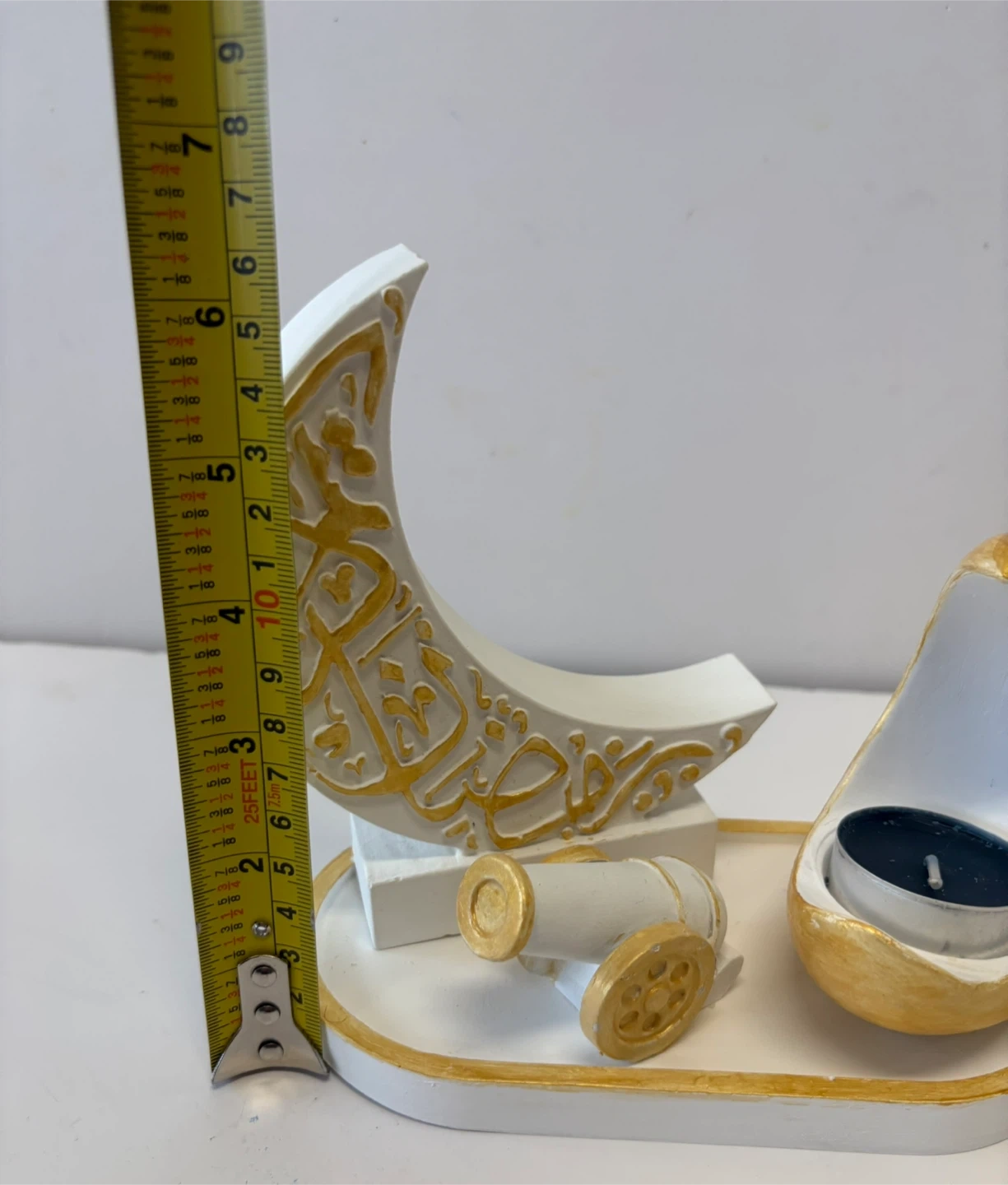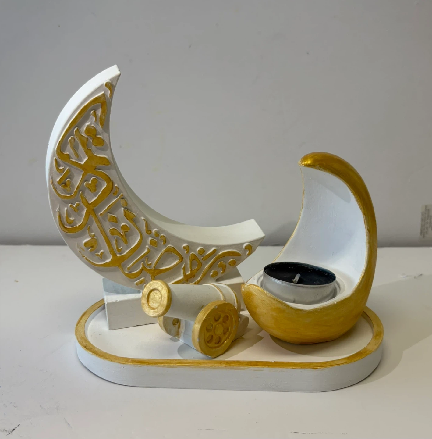 Celebrate the Holy Month with Artistry and Tradition Elevate your home’s ambiance with this handcrafted Jesmonite decorative set, designed to celebrate the spirit of Ramadan and Eid. This unique piece features a beautifully calligraphed crescent moon (Hilal) paired with a traditional Ramadan cannon and an incense burner box or you can use as trinket box set upon a sleek oval base. While this serves as a stunning centerpiece or mantel piece, it is also designed for functionality. The gold-toned box can be used as: • An incense burner (Bakhoor). • A tealight candle holder. • A small trinket dish for jewelry or tasbih beads.