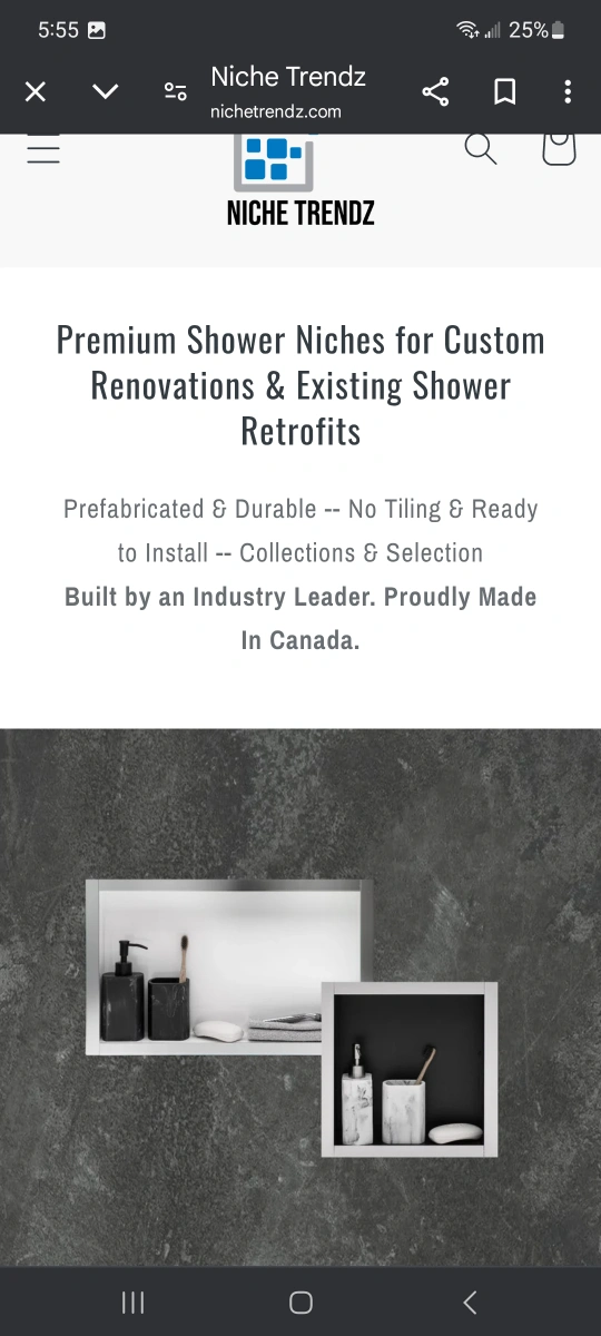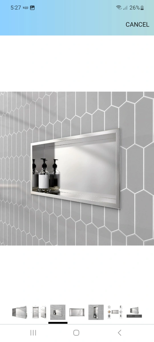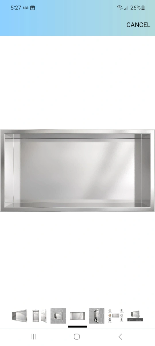 24 inch shower niche. Brushed nickel finish. Stainless steel construction. Integrated drip slope. Provides storage space. Fits into a standard wall. Round corners.