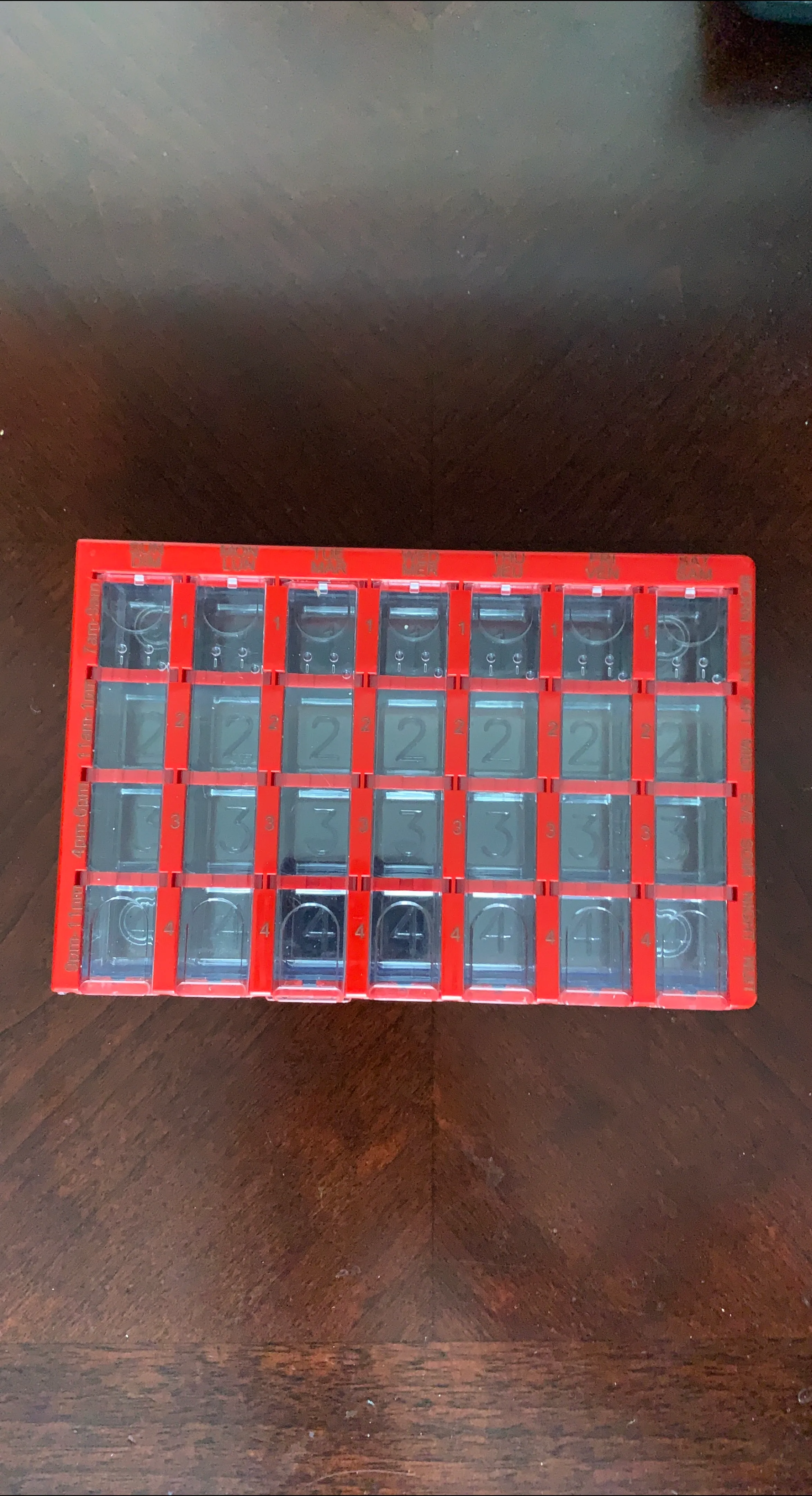 Red rectangular organizer. The organizer contains small compartments, for pills. The cover is clear with red trims. It is perfect for organizing your medication, bringing peace of mind to your day.