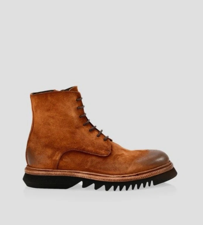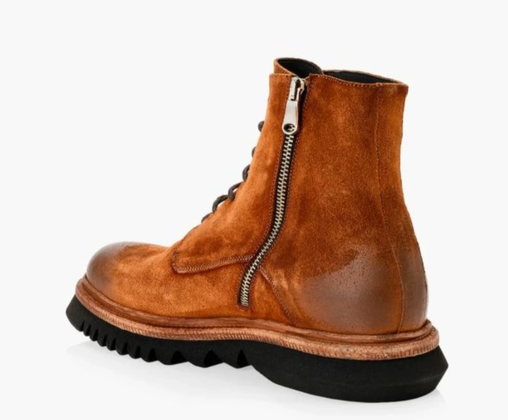 These stylish brown suede boots feature a rugged lug sole and a convenient side zipper. They're perfect for adding a touch of cool to any outfit. Leather and suede material construction.
