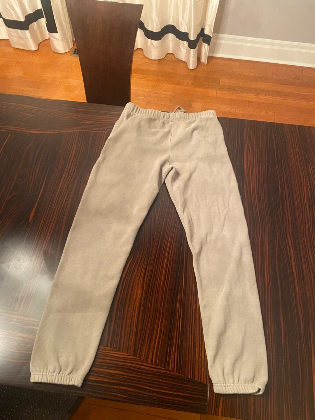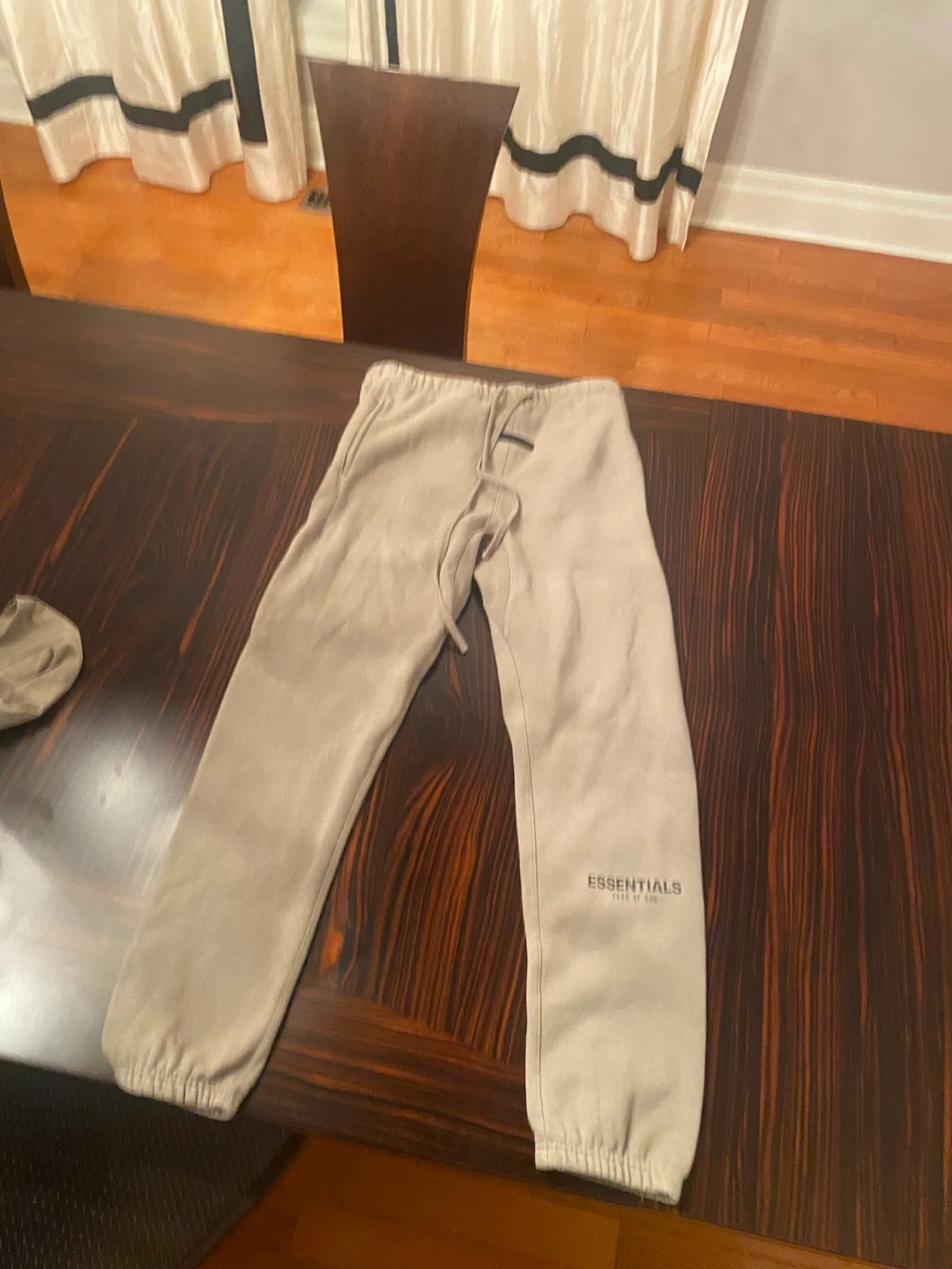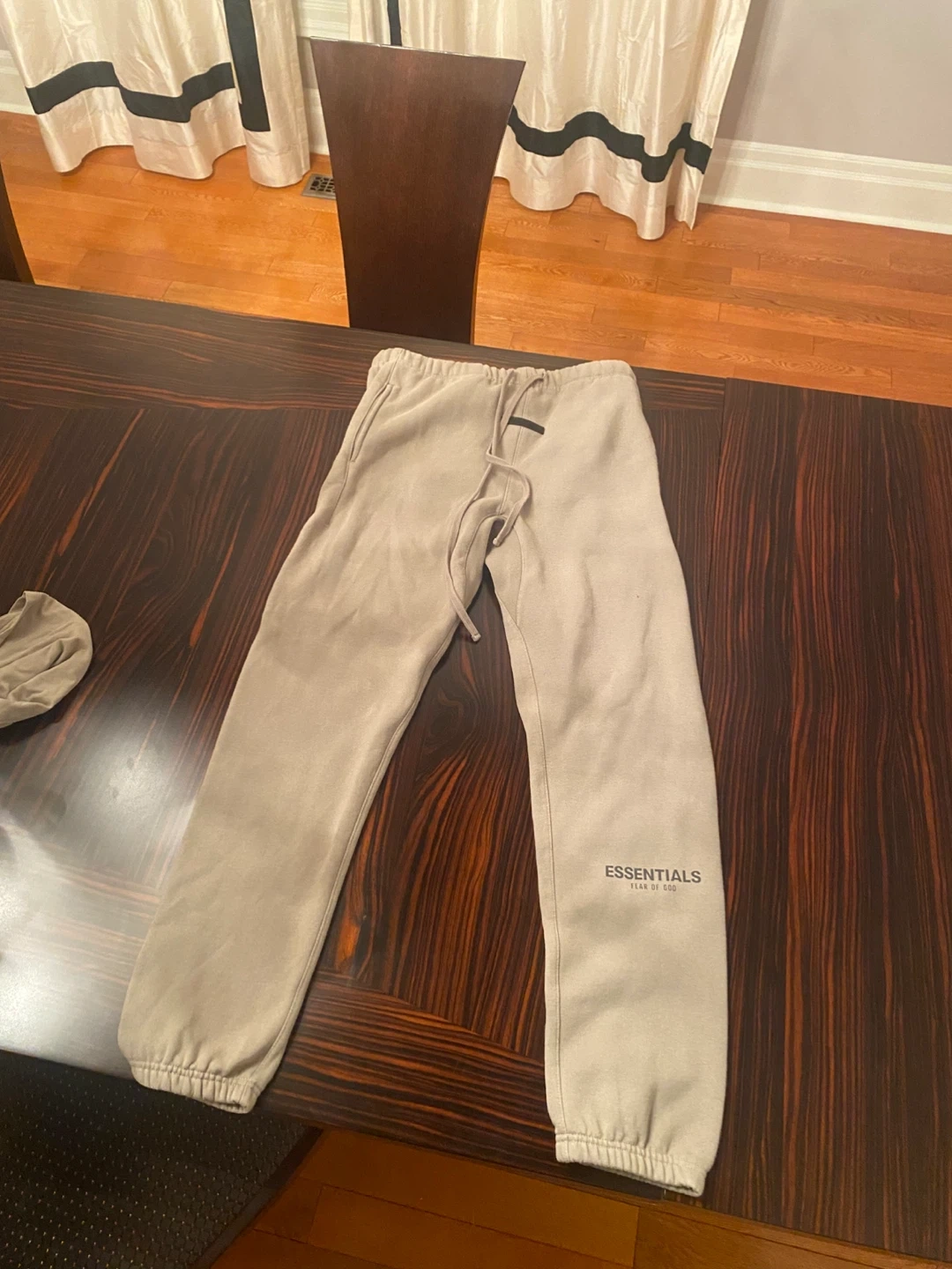 These are Fear of God Essentials sweatpants. They're a light beige colour. Soft and comfortable for everyday wear.