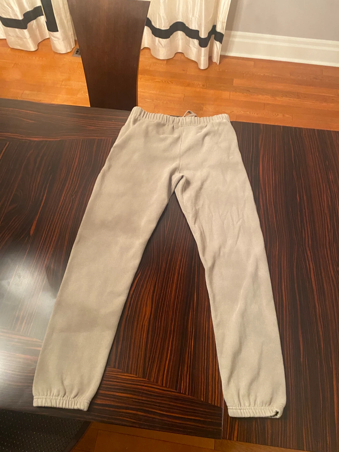 These are Fear of God Essentials sweatpants. They're a light beige colour. Soft and comfortable for everyday wear.