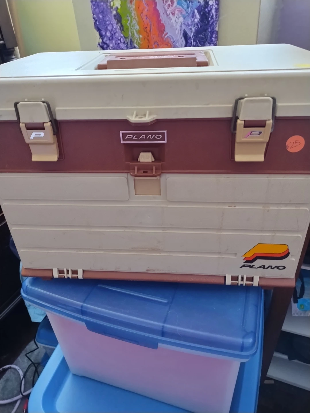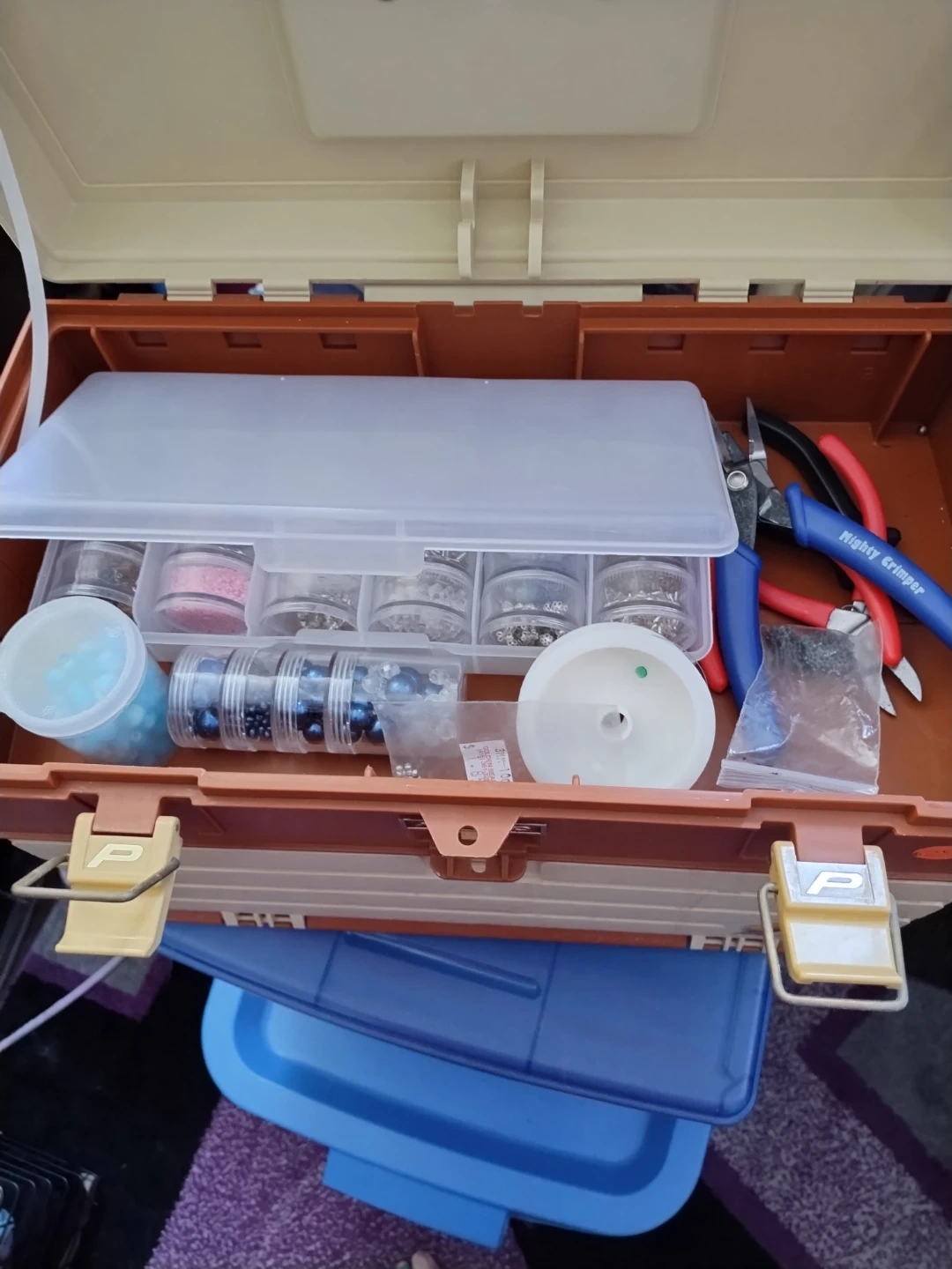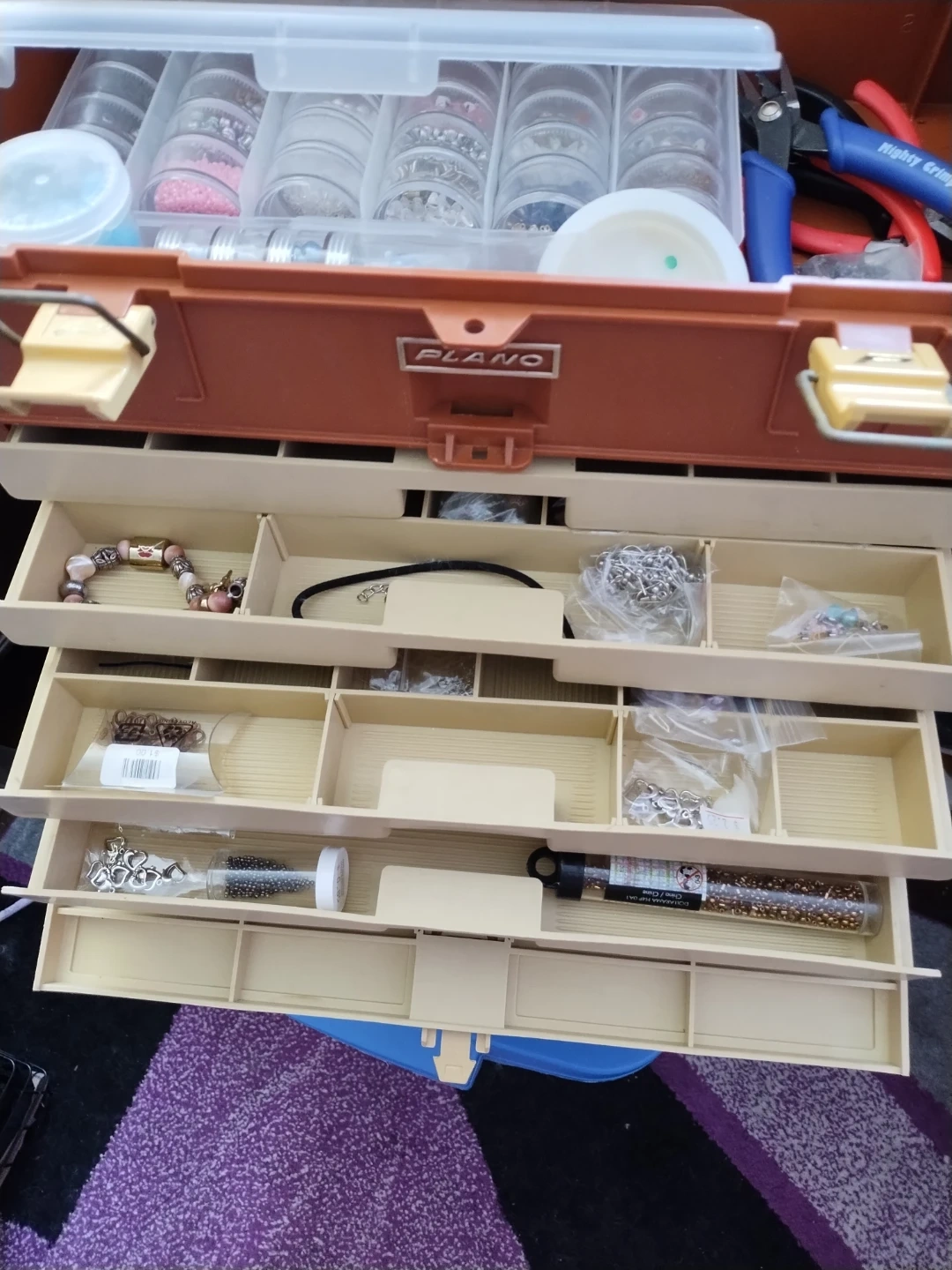 Vintage Plano 757 tackle box with multiple compartments. It's filled with various beads, chains, clasps, and jewelry-making tools like pliers. Great for organizing crafts or small items! Includes everything inside. Without contents, box is 25$.