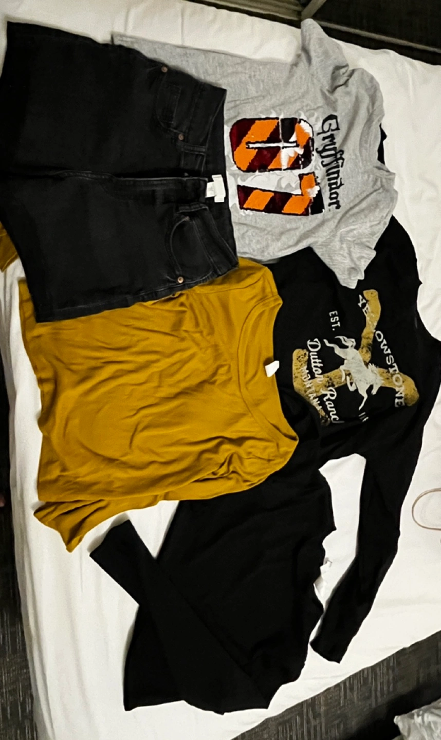 Four tops and a pair of black denim jeans. Mustard yellow long-sleeve shirt, black long-sleeve shirt, grey Gryffindor t-shirt, and black Yellowstone Dutton Ranch t-shirt. Great for layering or wearing individually.