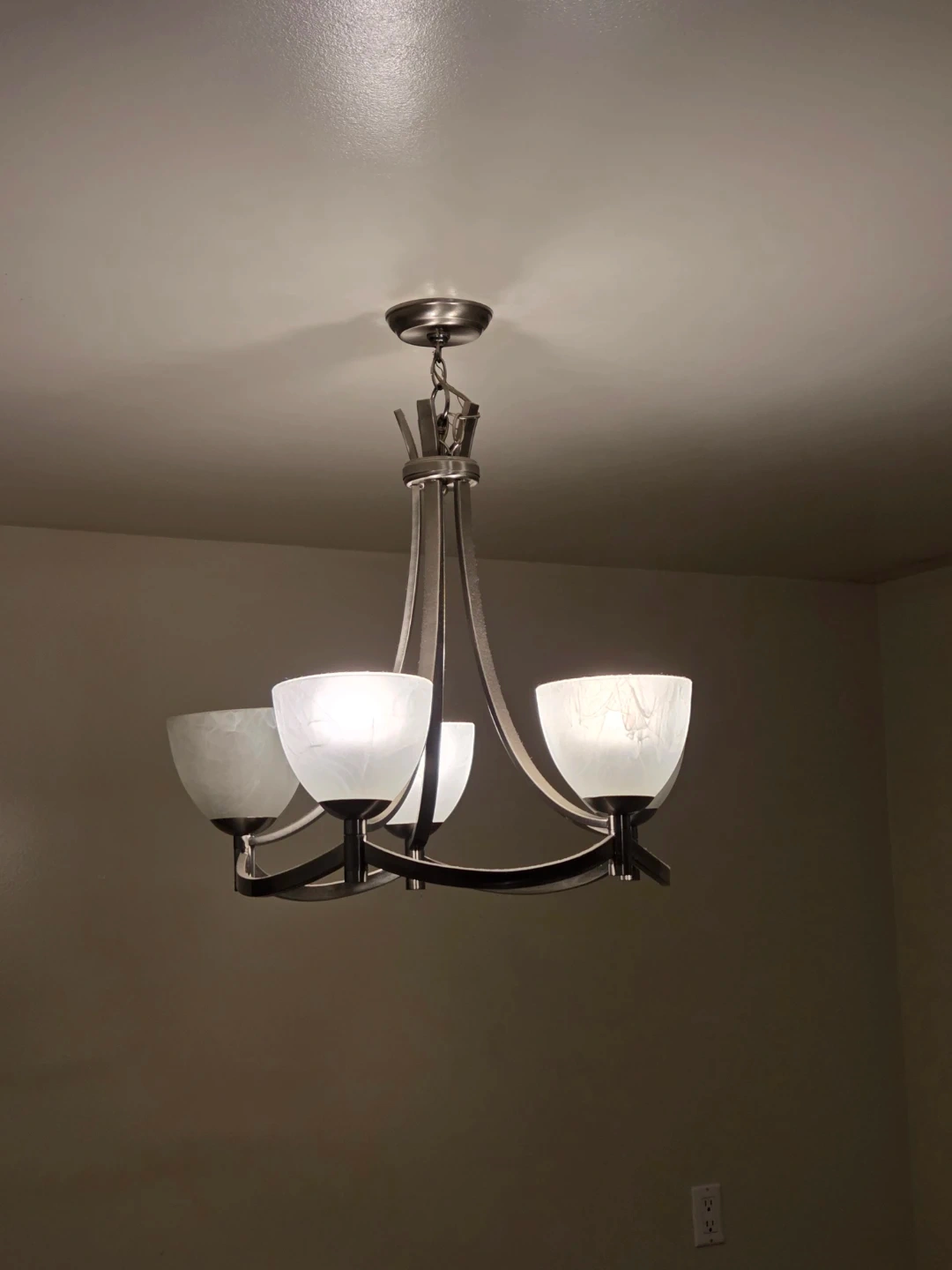 A brushed nickel chandelier with four frosted glass shades. This fixture provides warm ambient lighting for your dining room or living area. The overall design is contemporary with a touch of classic elegance.