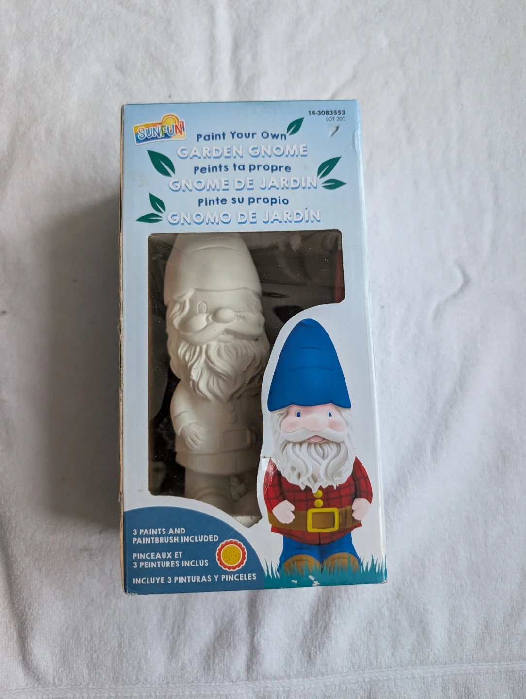 This is a new SunFun Paint Your Own Garden Gnome kit, perfect for adding a personal touch to your garden decor! It includes the gnome figurine, three paints, and a paintbrush, ready for you to unleash your creativity.