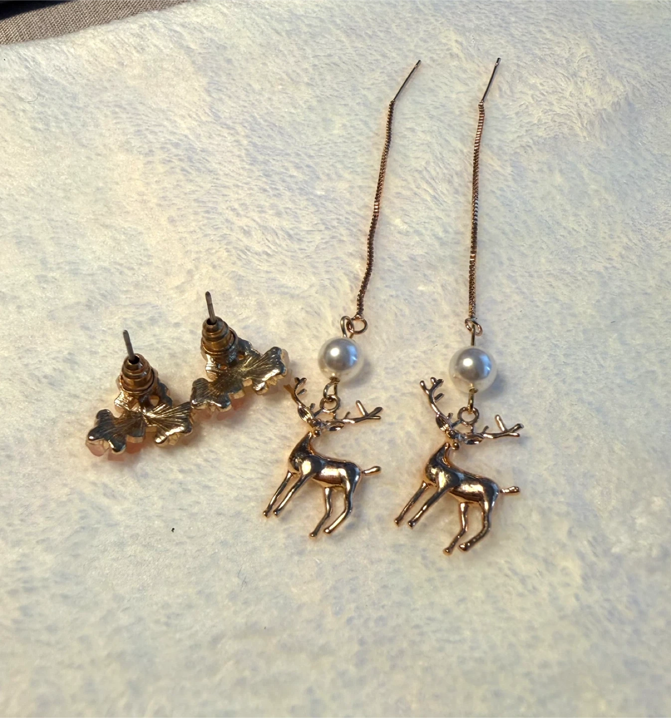 Gold Tone Deer & Pearl Threader Earrings+ pink flower earrings