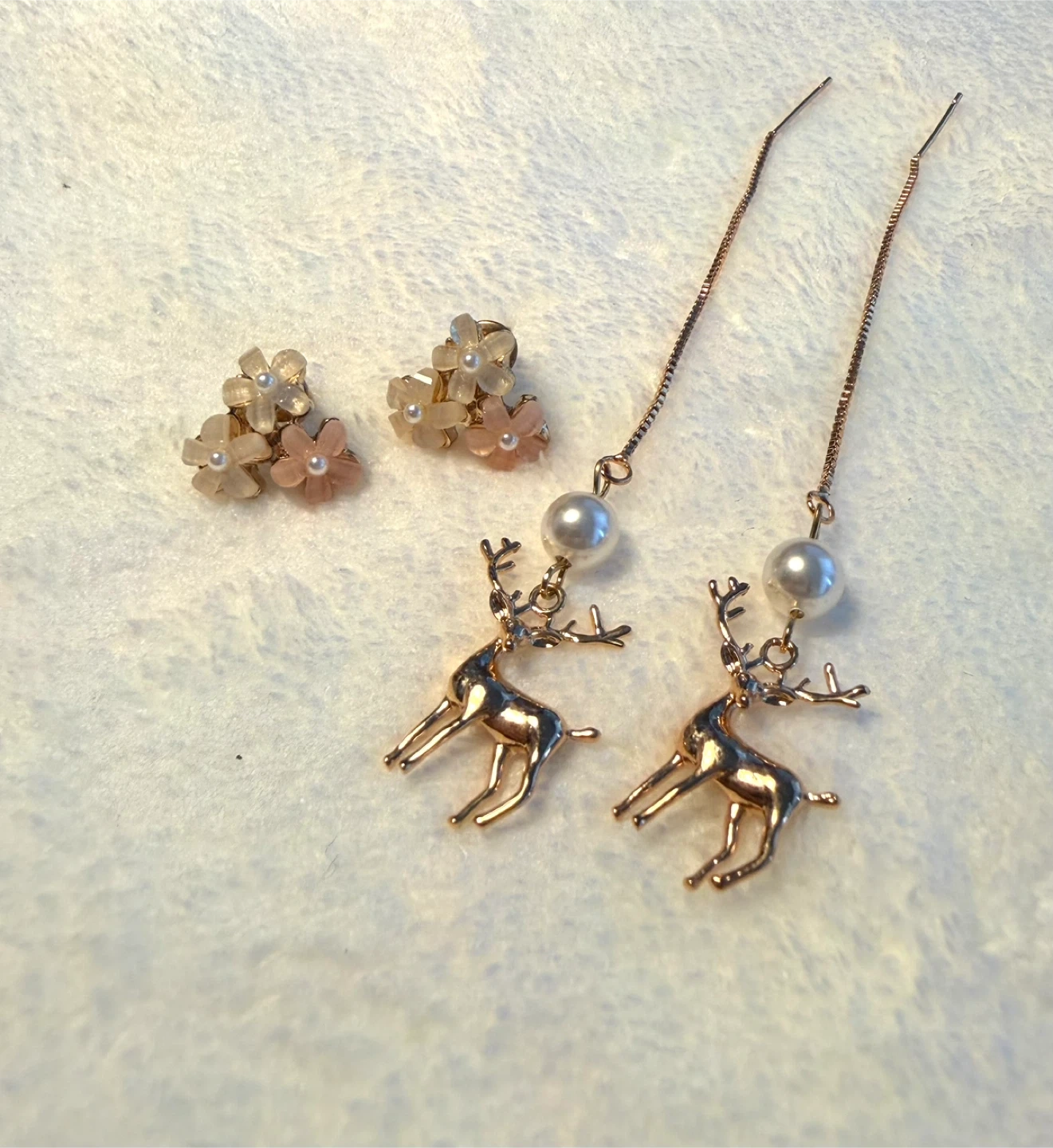 Gold Tone Deer & Pearl Threader Earrings+ pink flower earrings