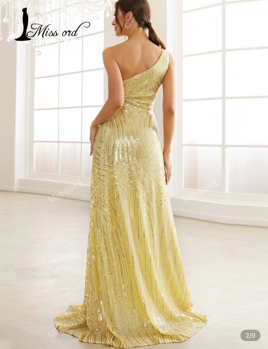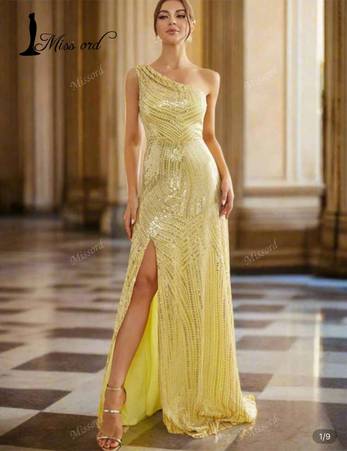 Selling a beautiful Miss Ord yellow sequin gown! This dress features a stylish one-shoulder design and a flattering slit. Perfect for a special occasion!