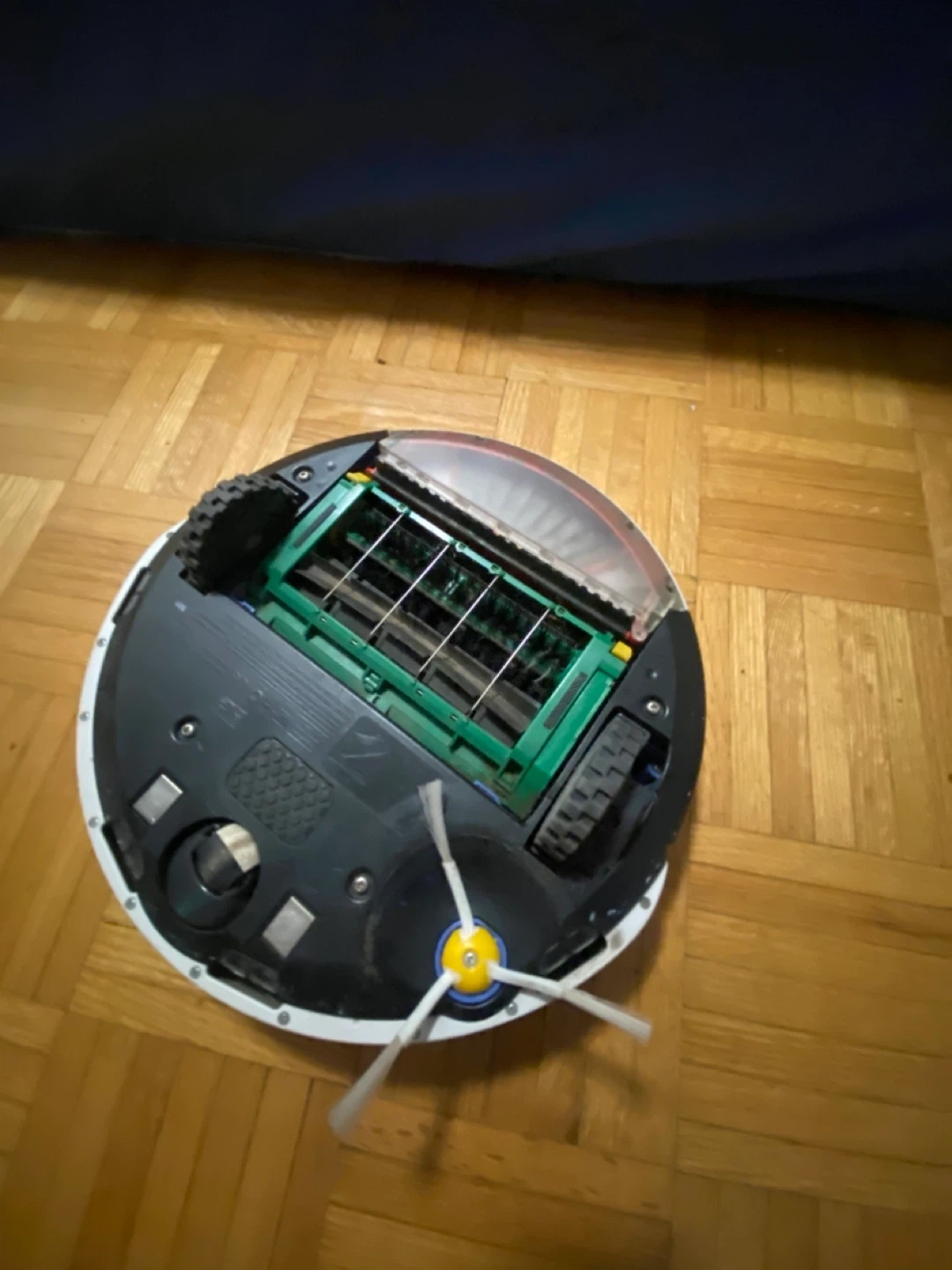 This is an iRobot Roomba robotic vacuum cleaner. It features a round design and wheels for mobility. The underside shows brushes for cleaning and a dustbin compartment. It's designed for automated floor cleaning.