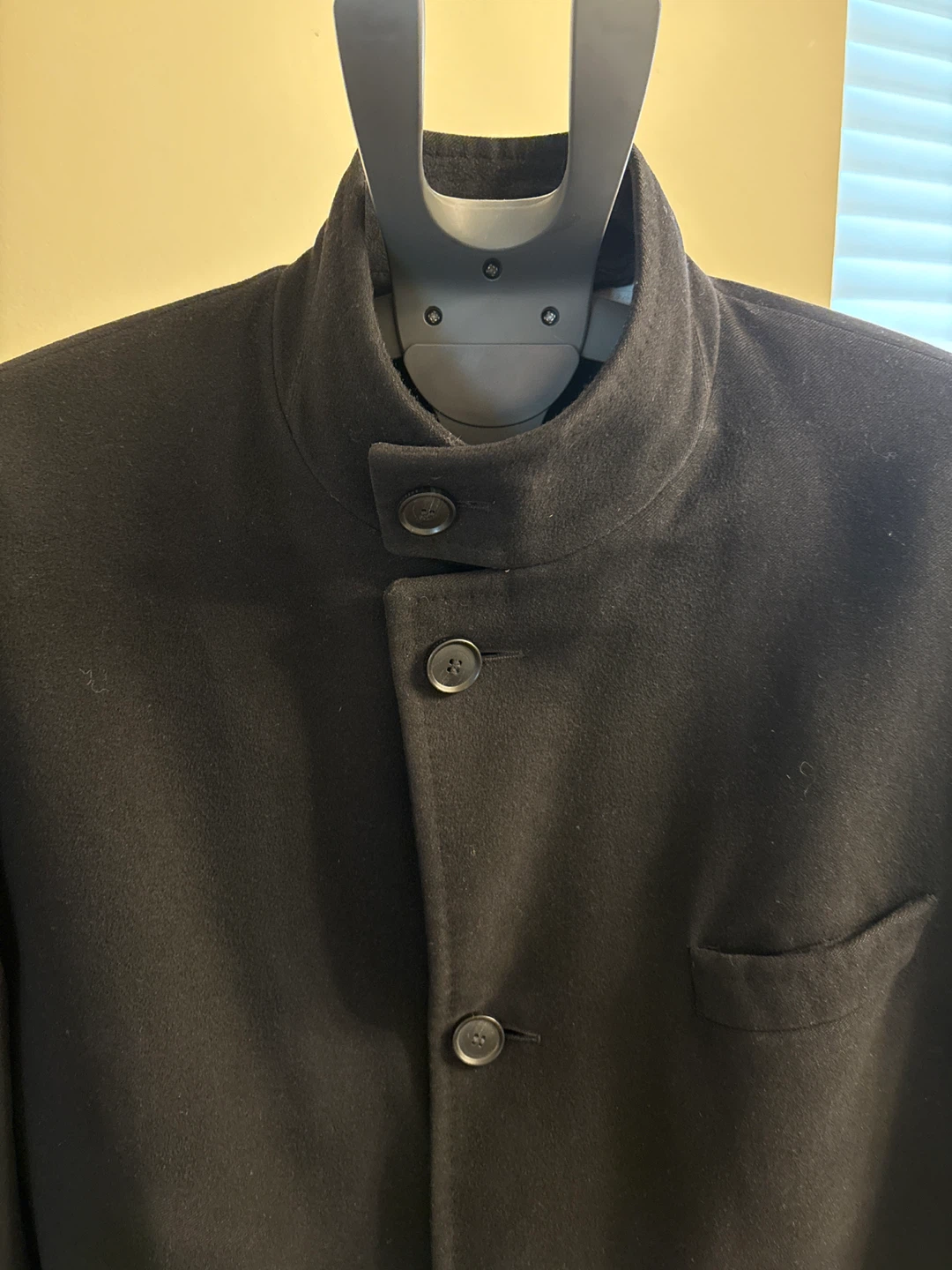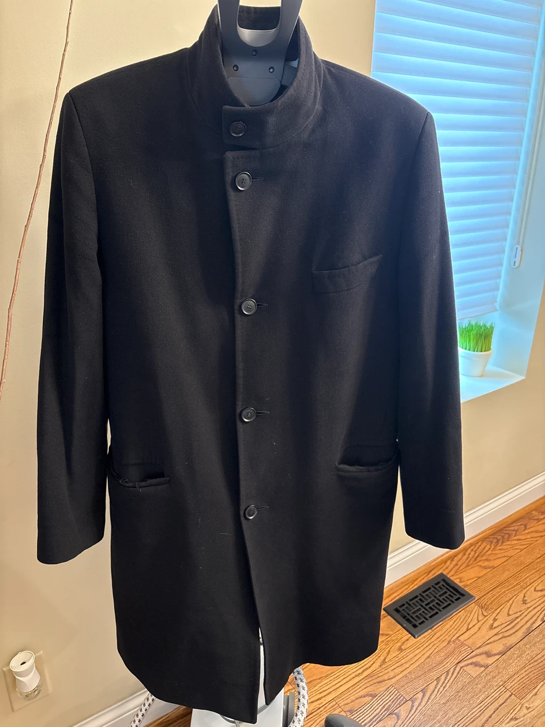 This is a black wool and cashmere blend coat from BOSS Hugo Boss. It's made in Italy and features a mandarin collar with a button closure. The coat is a size 46R. It's a great piece for cooler weather! Lining needs replacement. Some fraying on pockets.