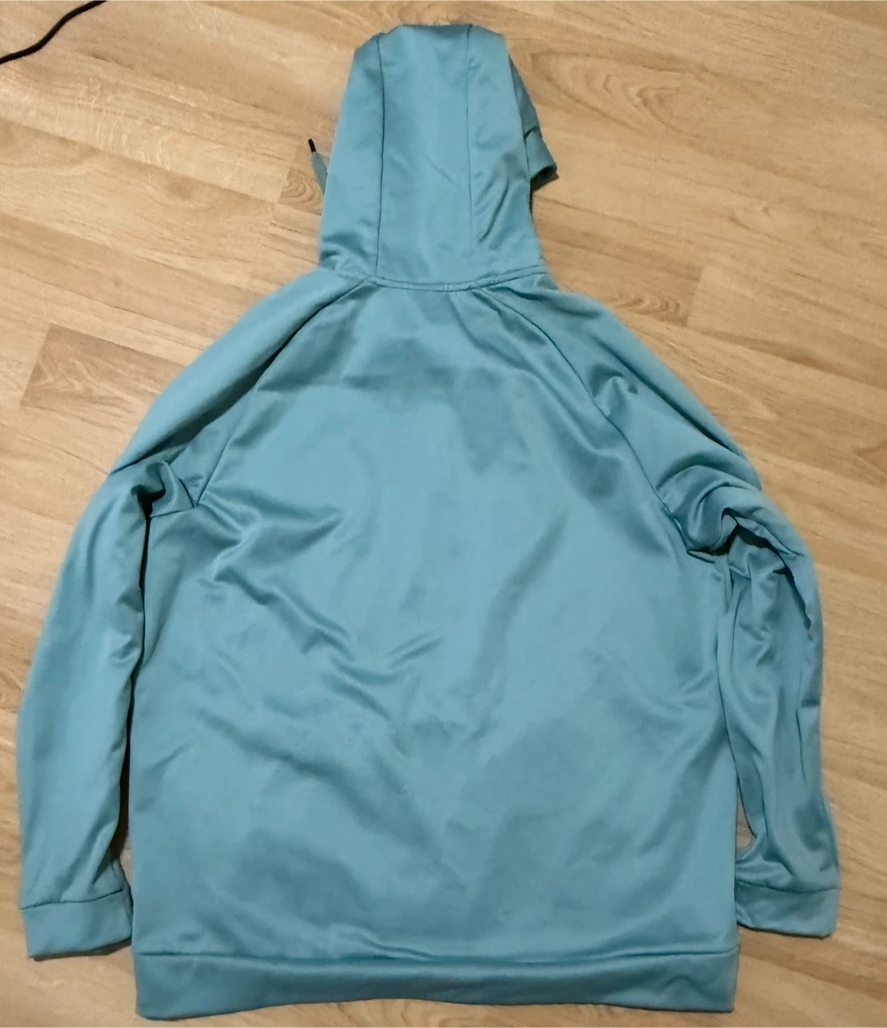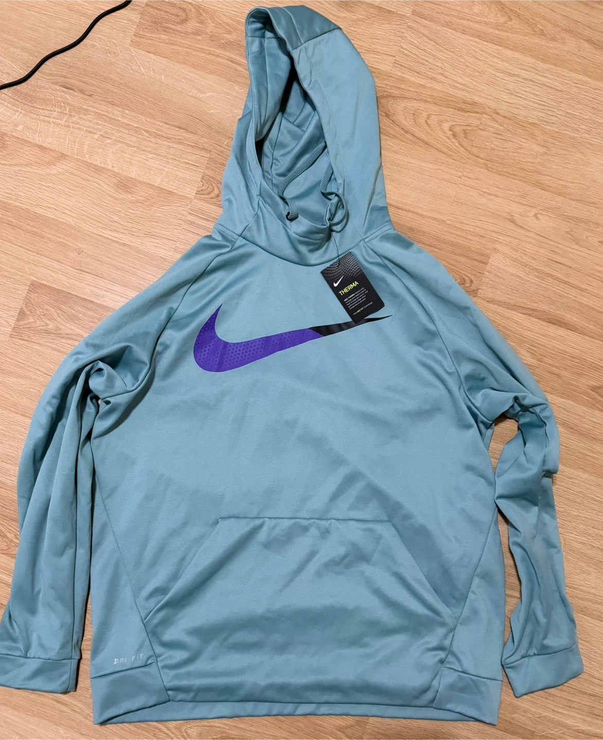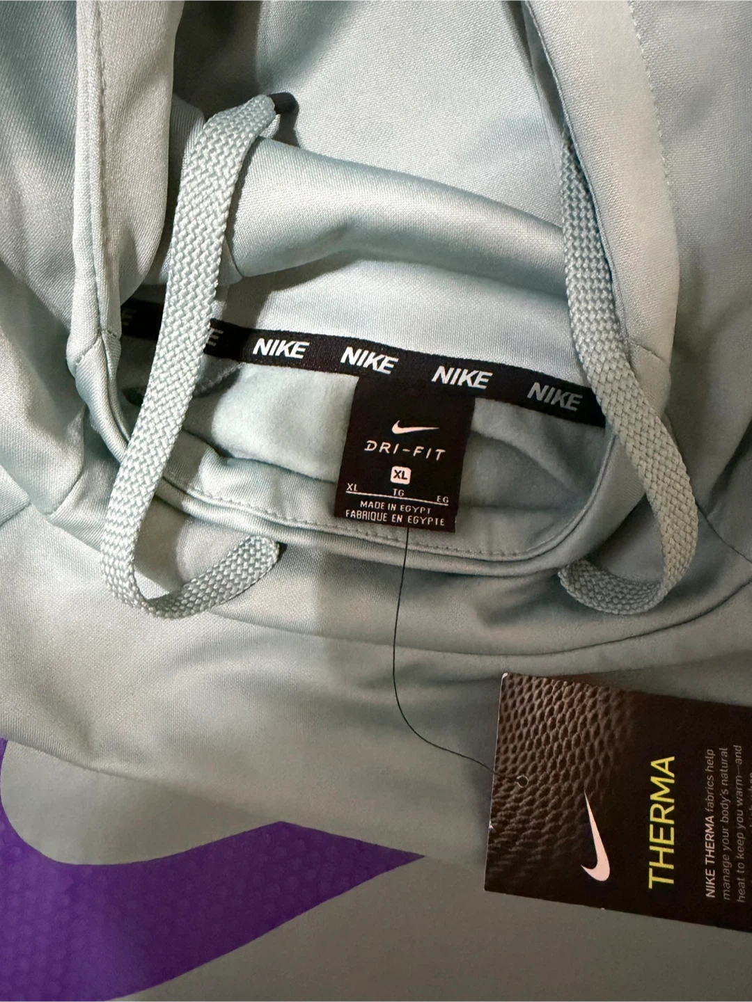Light blue Nike Dri-FIT Therma hoodie with a large purple swoosh logo. It's made with Therma fabric to help keep you warm. Size XL.