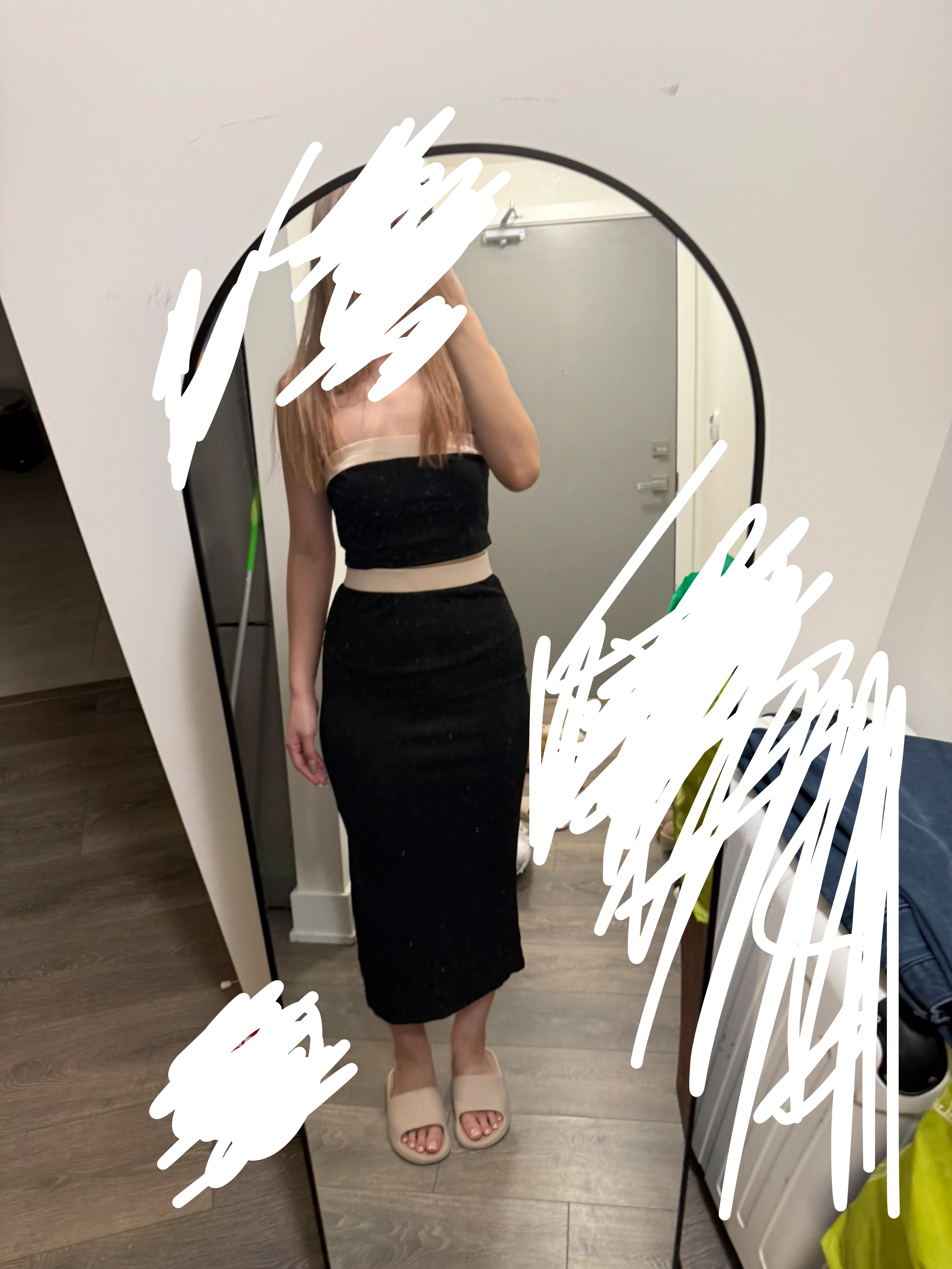 Two-piece set style strapless midi dress. Features a black ribbed knit top and skirt with a nude trim detail at the bust and waist. Comfortable and chic for any occasion!