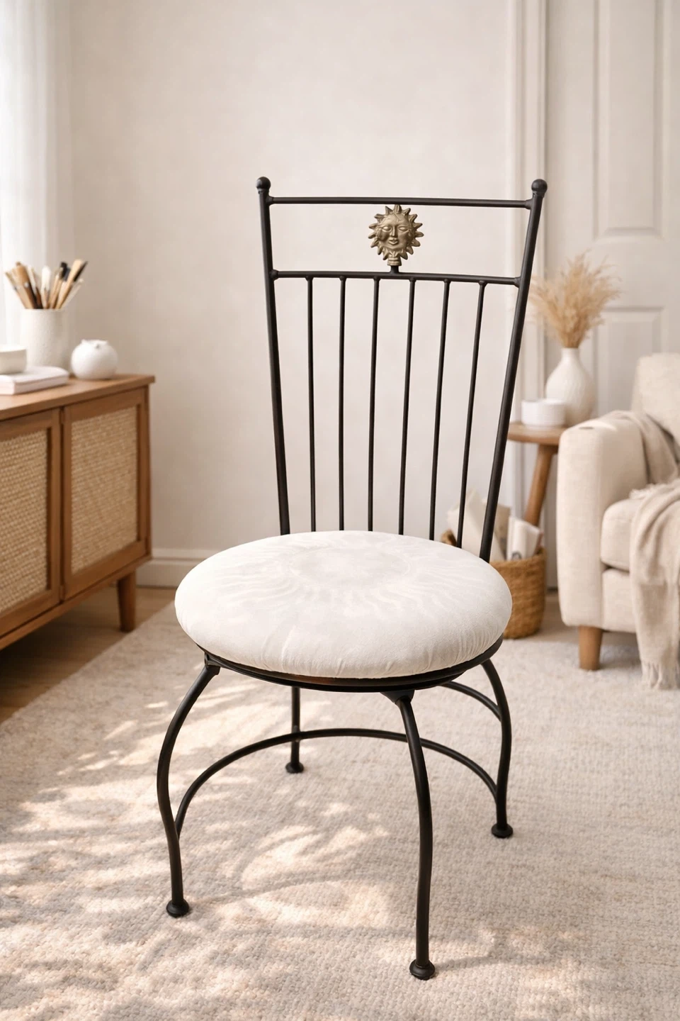 This metal dining chair features a decorative sun motif on the backrest and a cushioned seat. Its dark metal frame provides a sturdy base. It's a charming accent piece for a kitchen or dining area.