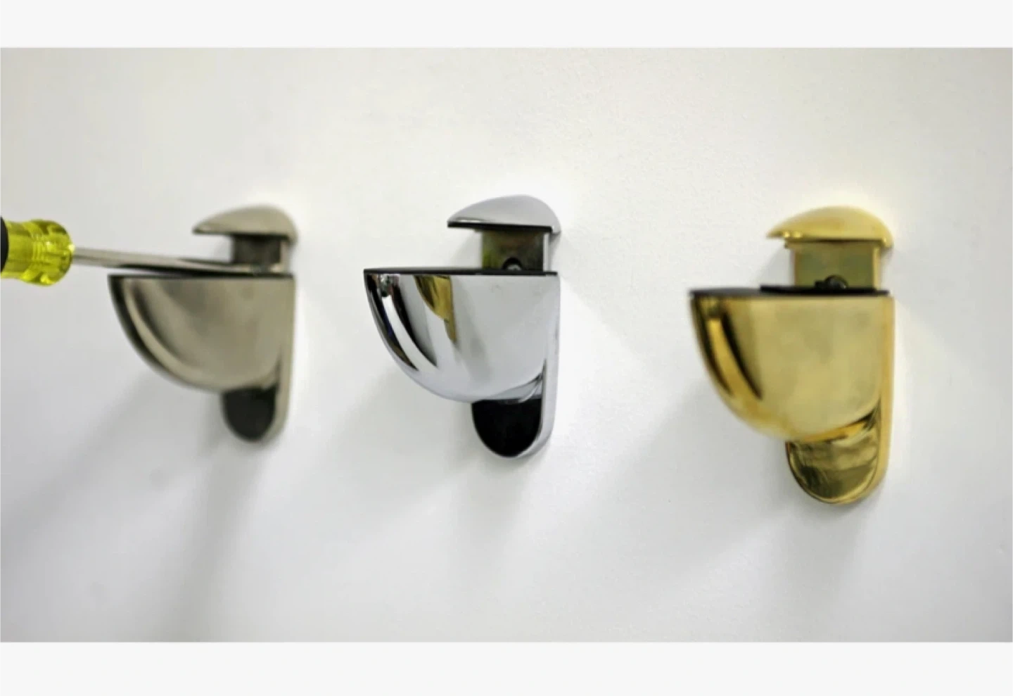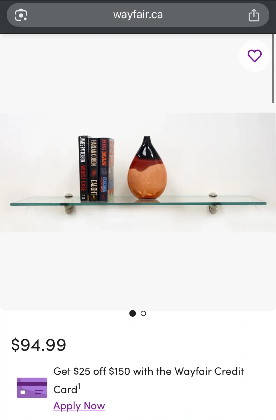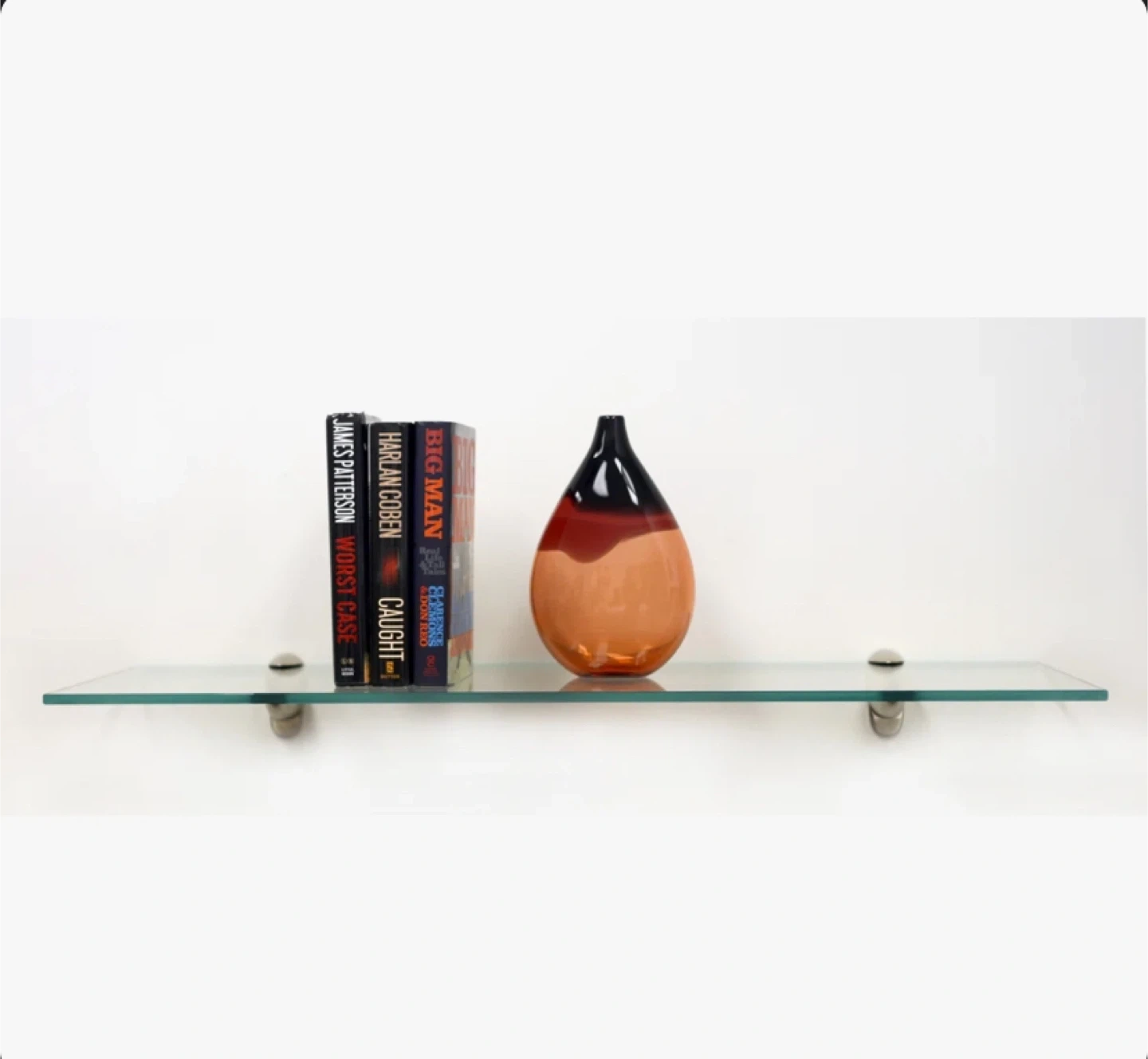 A clear glass shelf with metal brackets for mounting. It's designed to hold decorative items or books. Brackets are in chrome. Glass shelf is in great condition and ready to use! Originally 95$