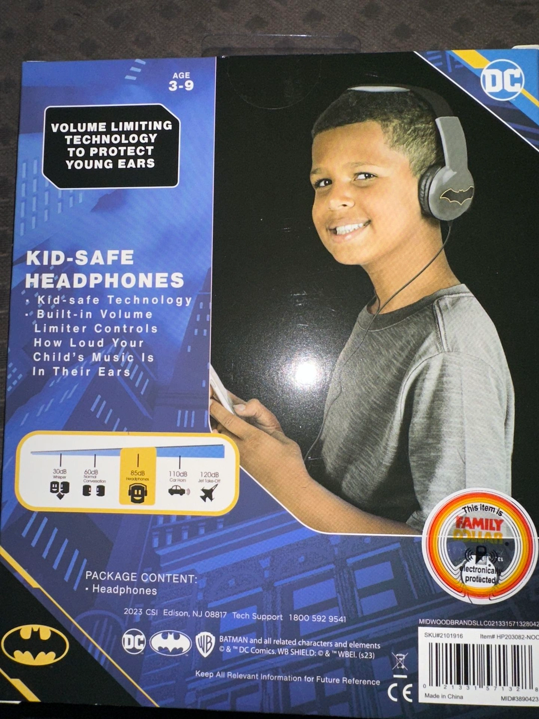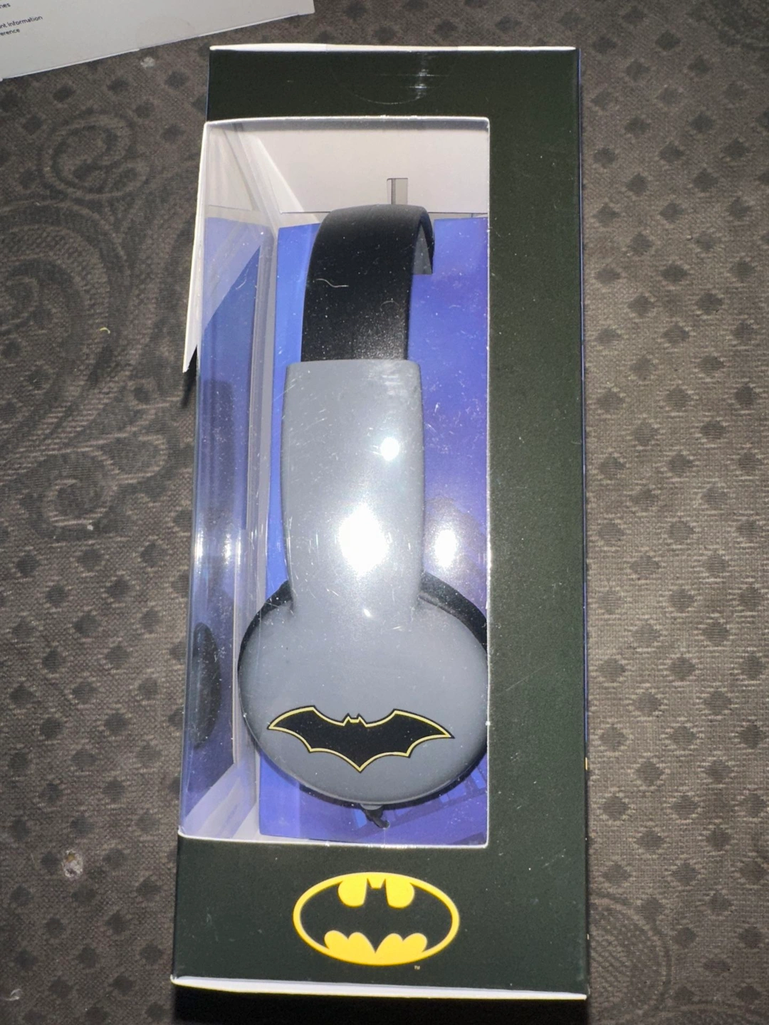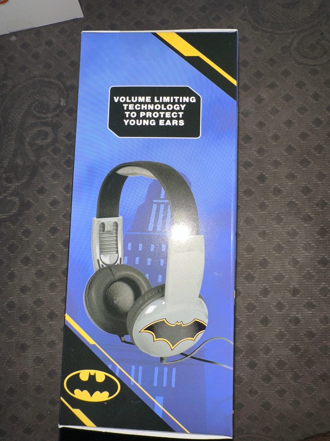 Selling a brand new pair of Batman Kid-Safe Headphones, perfect for ages 3-9! These headphones feature volume limiting technology to protect young ears. The package includes the headphones themselves, ready for your little superhero to enjoy!