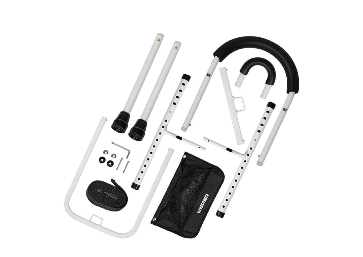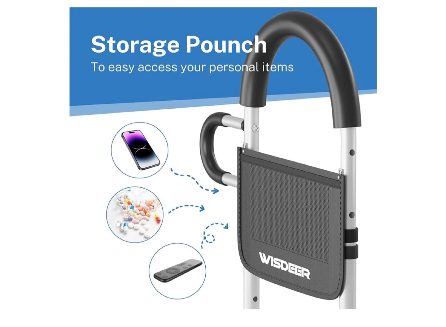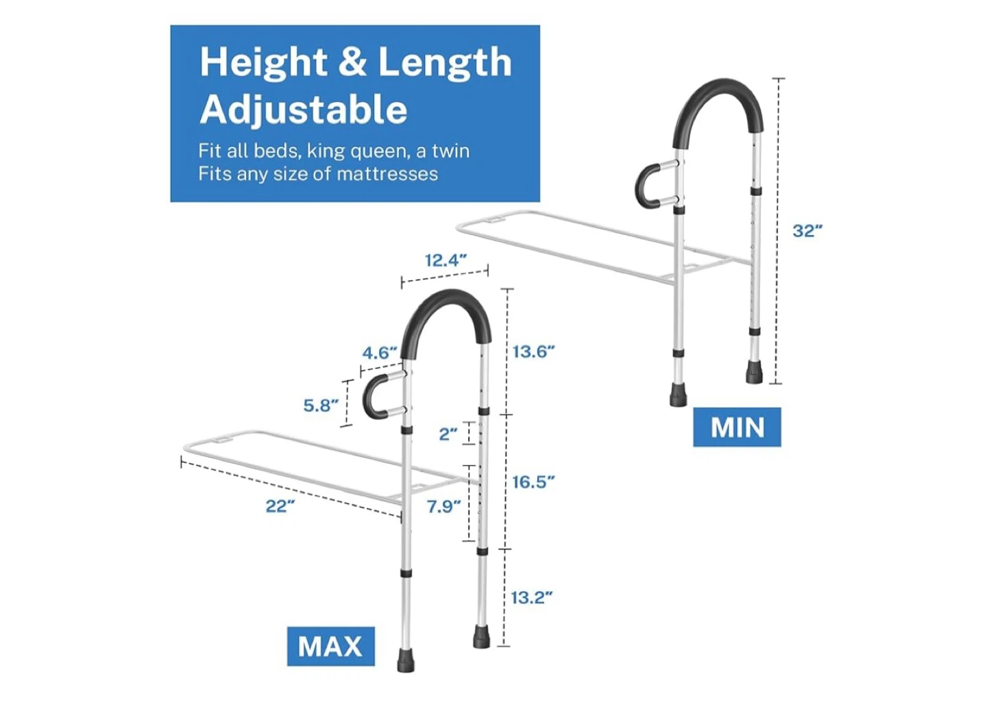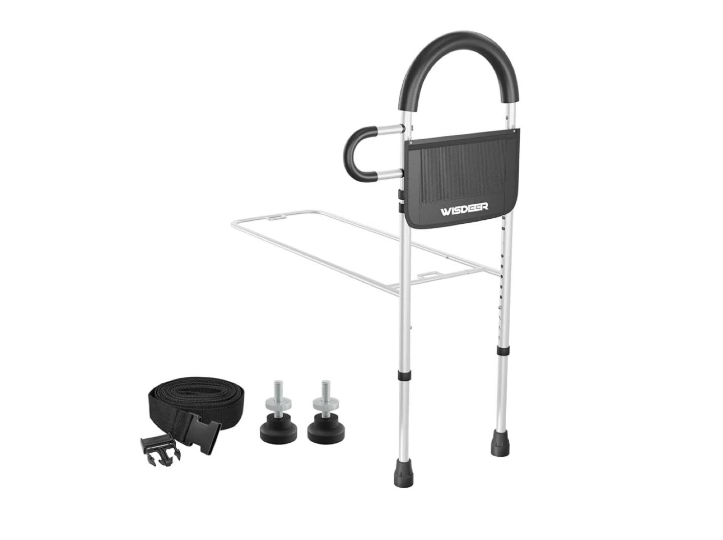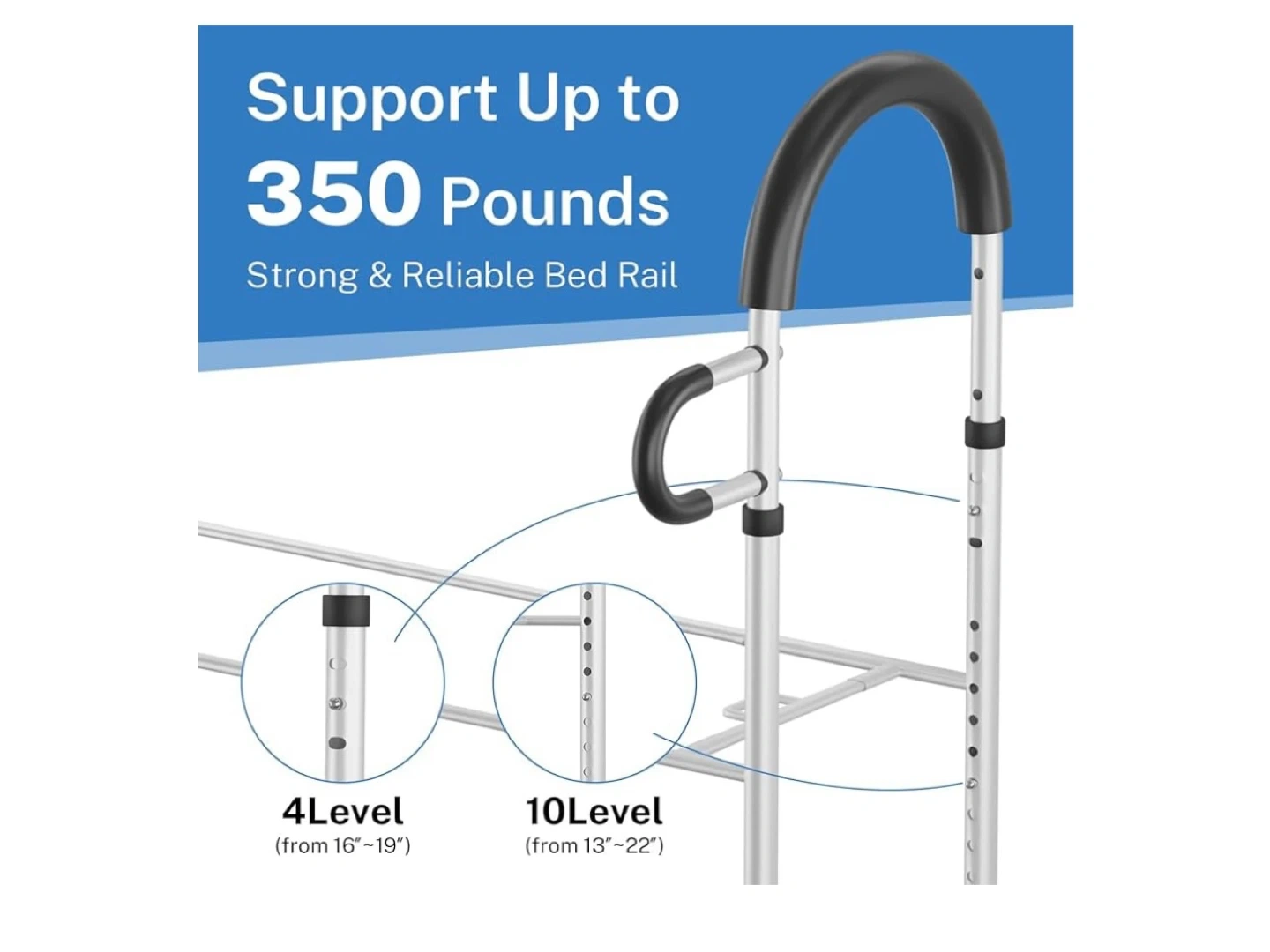 This WISDEER bed rail provides support and stability, assisting in getting in and out of bed. It's designed with an adjustable height and length to fit all bed sizes, from twin to king. The rail can support up to 350 pounds, ensuring a strong and reliable support system. It also features a non-slip comfortable handle to minimize the risk of falls. The rail is adjustable from 16"-19" (4 levels) and 13"-22" (10 levels).