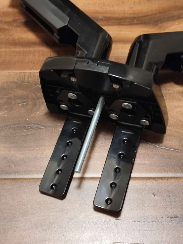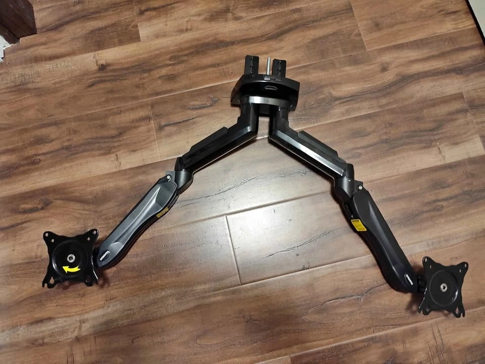 Huanuo dual monitor arm. Can hold two 27-34" computer monitors. Needs a hole drilled through the desk for mounting (see third picture). All hardware is included, and no pieces are missing. It was never installed. This model screws through the desk. Pickup near Mavis and Derry Road, Mississauga.