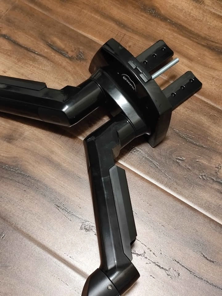 Huanuo dual monitor arm. Can hold two 27-34" computer monitors. Needs a hole drilled through the desk for mounting (see third picture). All hardware is included, and no pieces are missing. It was never installed. This model screws through the desk. Pickup near Mavis and Derry Road, Mississauga.