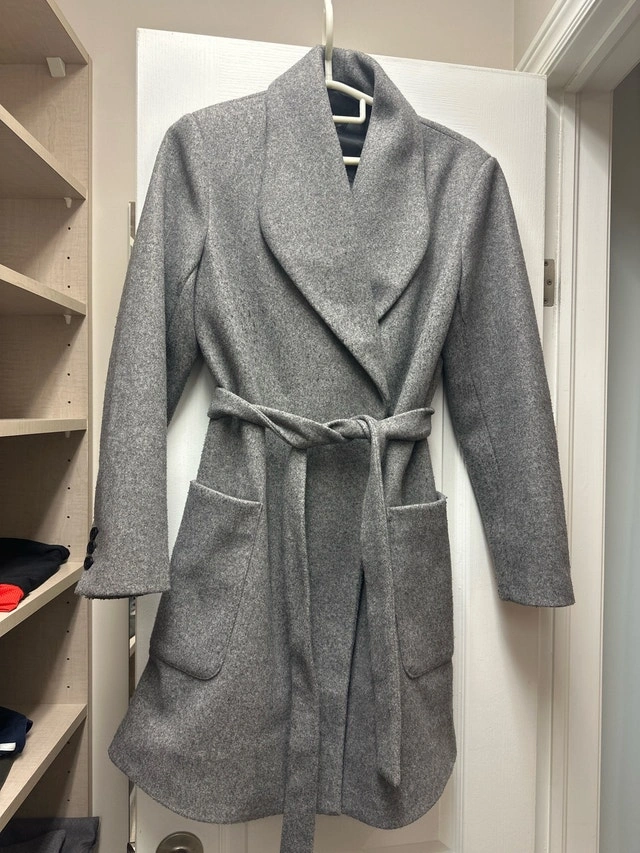 This stylish grey wool coat is perfect for chilly days, featuring a tie waist and a flattering silhouette. This coat has been worn, but is in great shape. It's ready for a new home! If the ad is up, it's available. Cashless payment and cash are accepted.