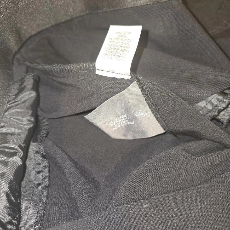 The Dana Buchman Curvy Straight Black Tie Dress Pants in size 16 are designed for workwear occasions. Made from a polyester/rayon/spandex blend, these pants feature a solid black color with a relaxed fit through the hip and thigh, and a straight leg style. The pants have a mid-rise waist with an elastic waistband for comfort. Easy to care for, they are machine washable and accented with buttons for a polished look. Perfect for a professional yet stylish work environment.