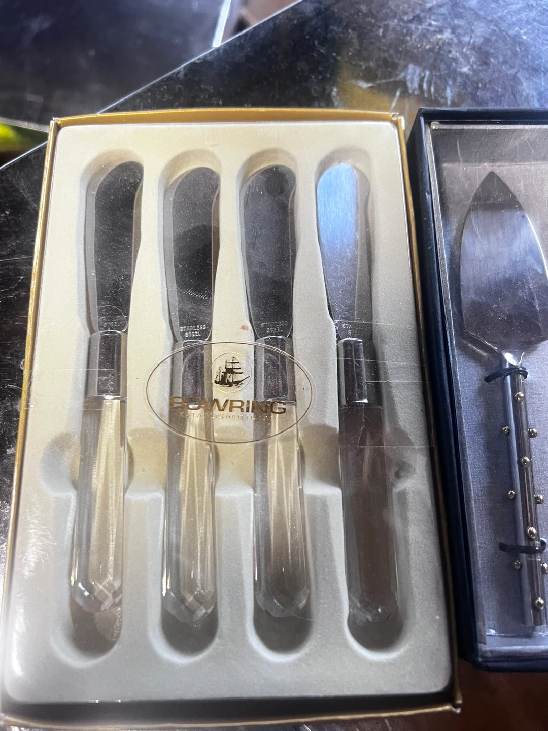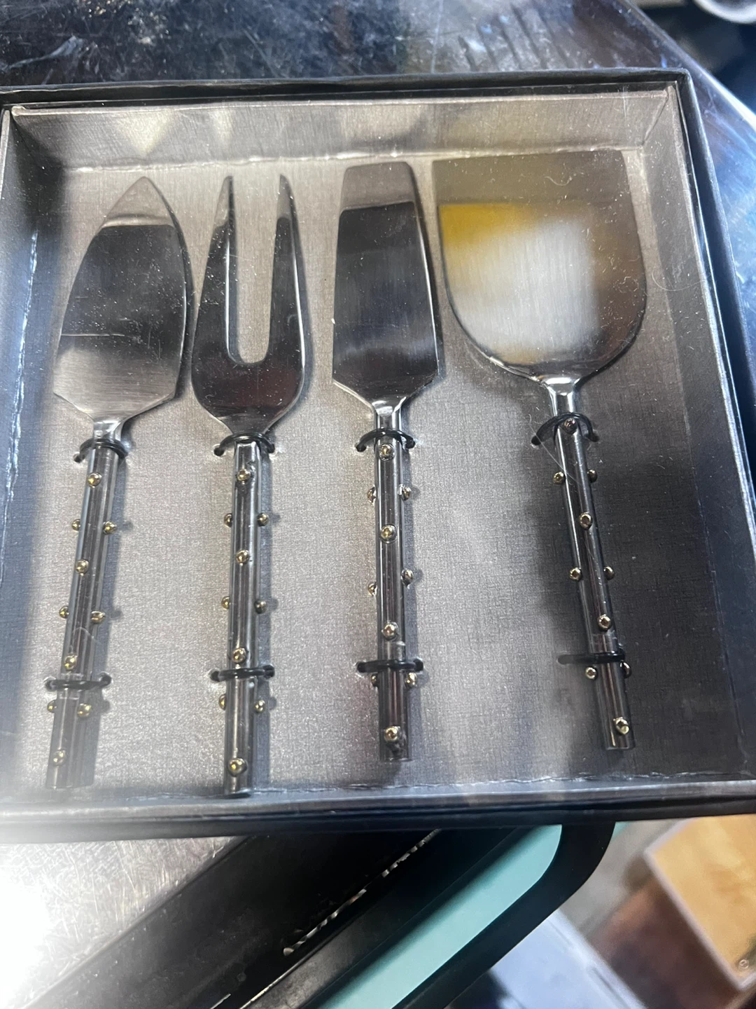 Four stainless steel cheese knives with decorative handles. Includes a cheese spade, a cheese fork, and two spreading knives. All pieces are presented in a gift box. Perfect for serving cheese at gatherings!