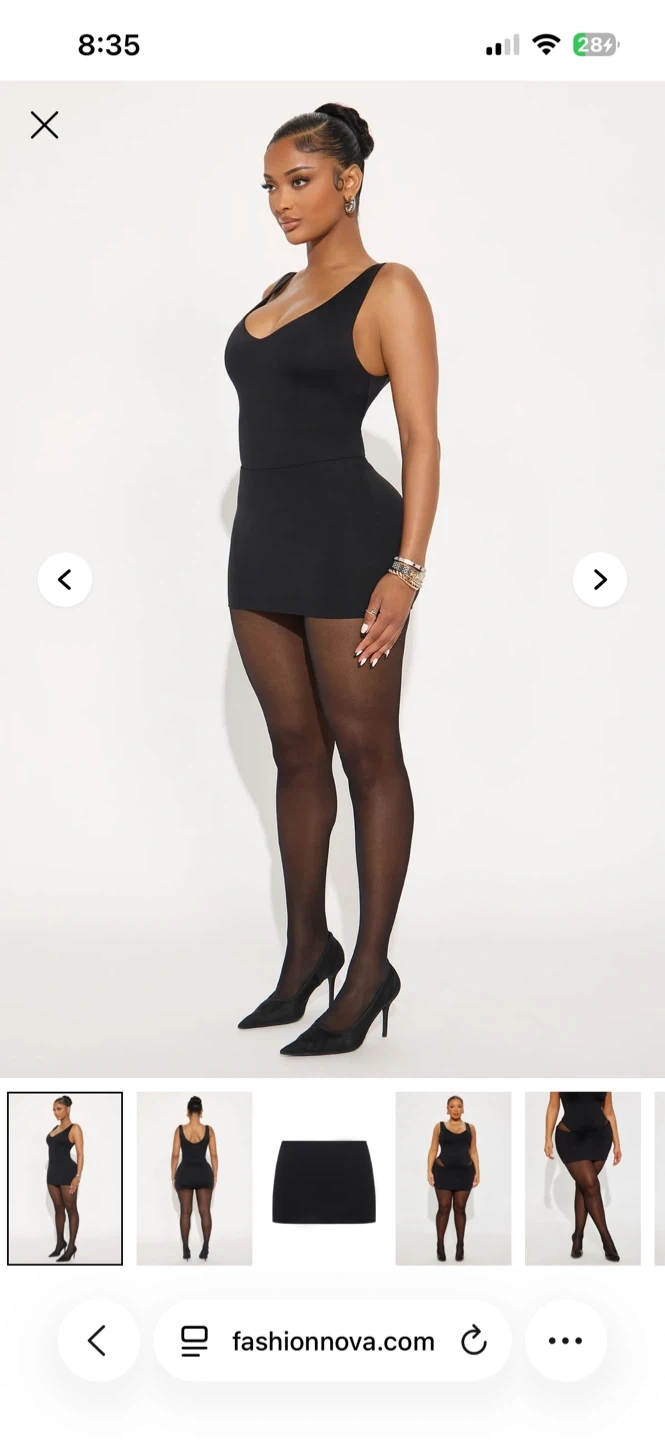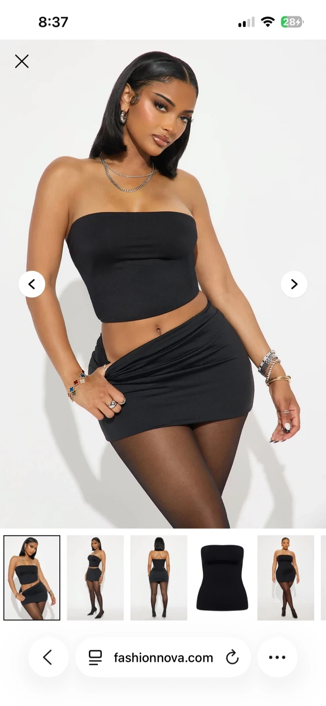 This is a black contour mini skirt set with tube top from Fashion Nova. It's made of a stretchy fabric and has a flattering fit. Perfect for a night out or a casual day look!