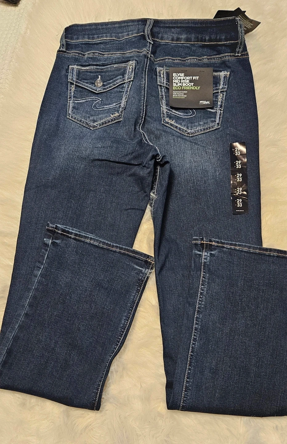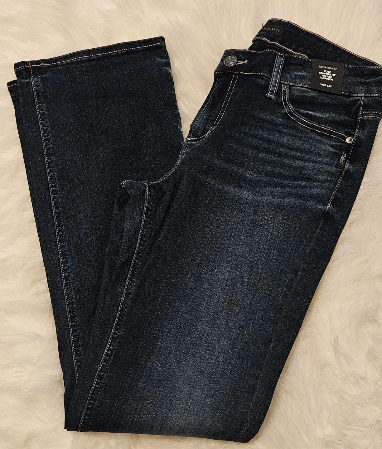 Silver Jeans Co. Elyse bootcut jeans with a comfort fit and mid rise slim boot. These jeans are eco-friendly. Denim material.