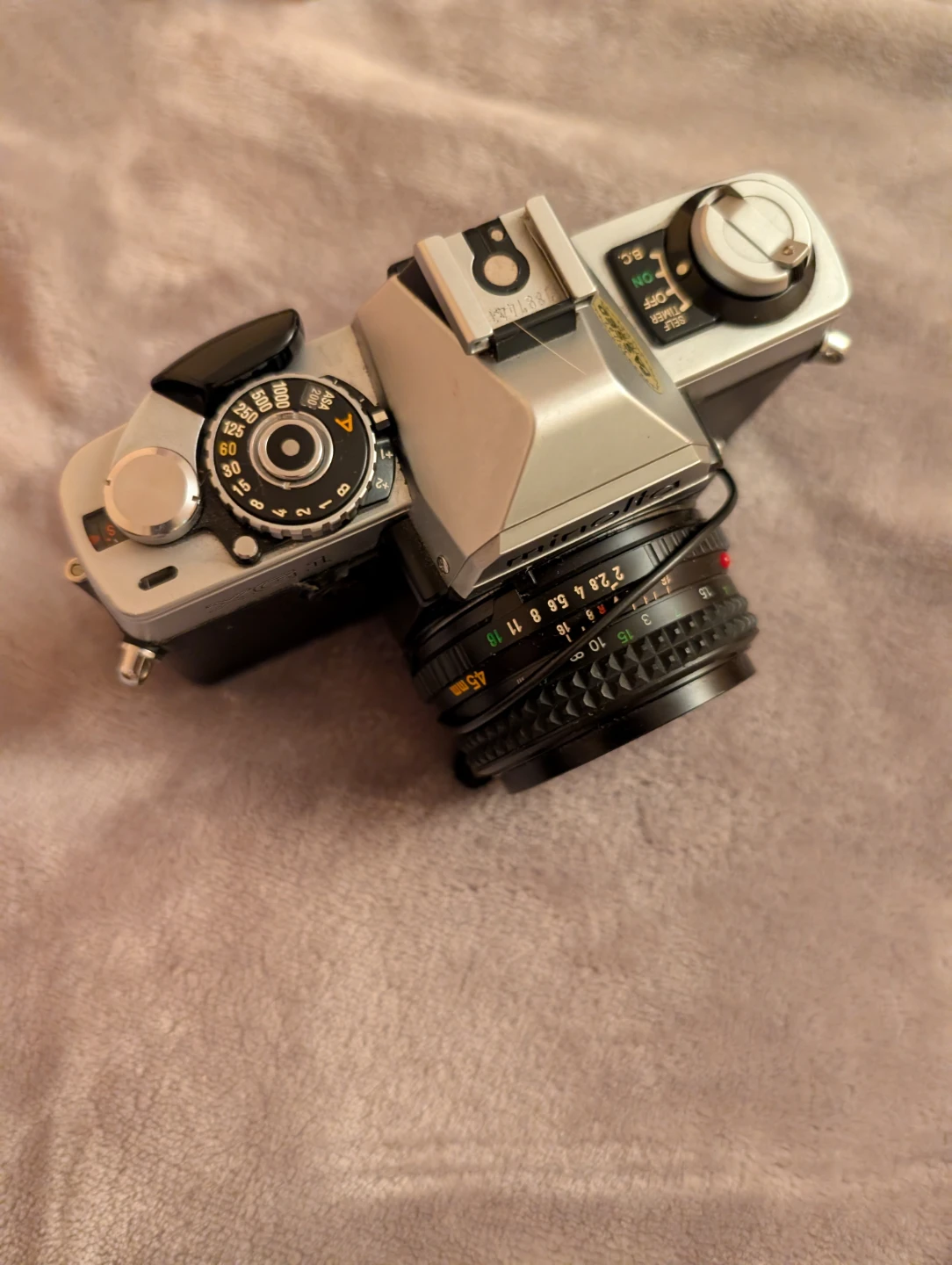This is a vintage Minolta XG-1 35mm film camera. It's paired with a Minolta MD Rokkor-X 45mm f/2 lens.