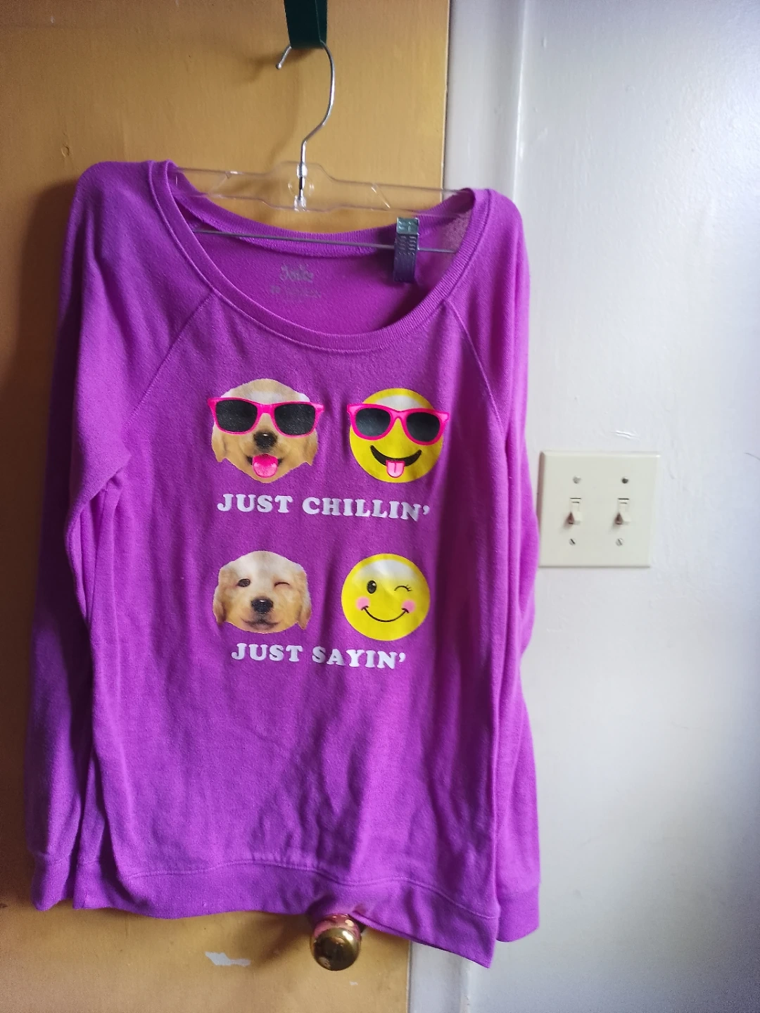 This Justice long-sleeve shirt is a fun purple colour. It has "JUST CHILLIN'" and "JUST SAYIN'" graphics with dog faces and emojis. It's made of a soft fabric and perfect for casual wear.