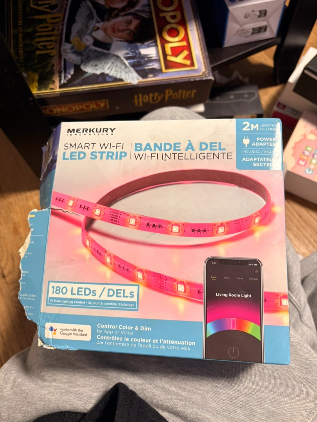 This is a 2-meter Merkury Innovations Smart Wi-Fi LED strip light. It features 180 LEDs and is controllable via app or voice with Google Assistant. The strip light includes a power adapter and mounting accessories. Box is beat up but LED lights never been used