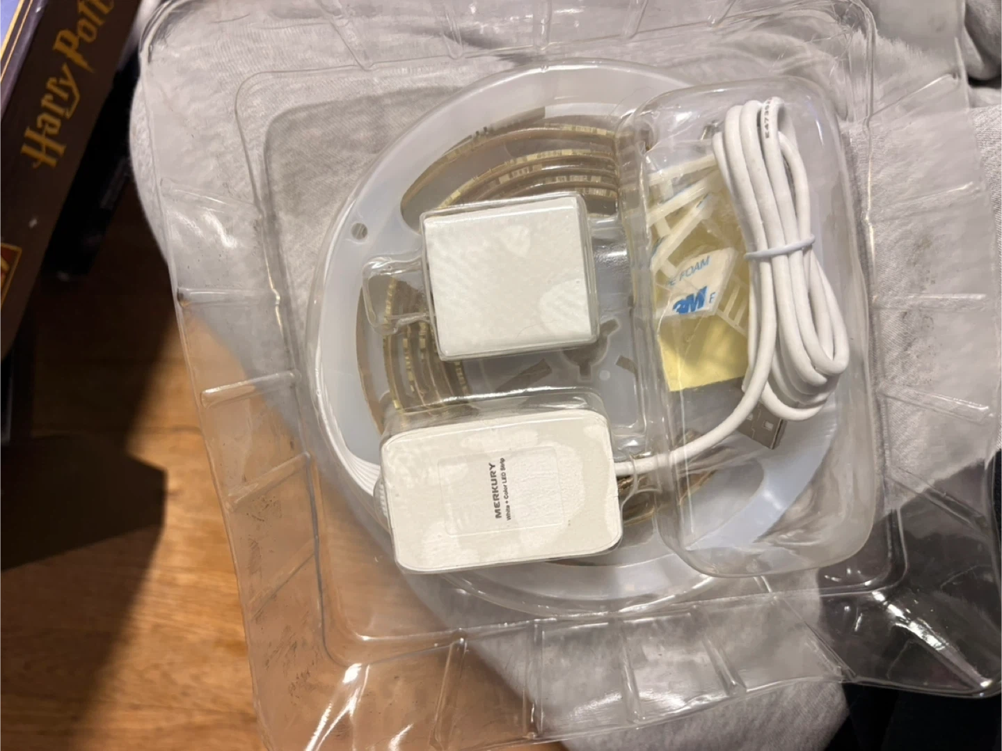 This is a 2-meter Merkury Innovations Smart Wi-Fi LED strip light. It features 180 LEDs and is controllable via app or voice with Google Assistant. The strip light includes a power adapter and mounting accessories. Box is beat up but LED lights never been used